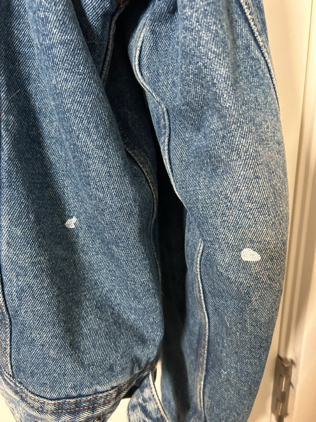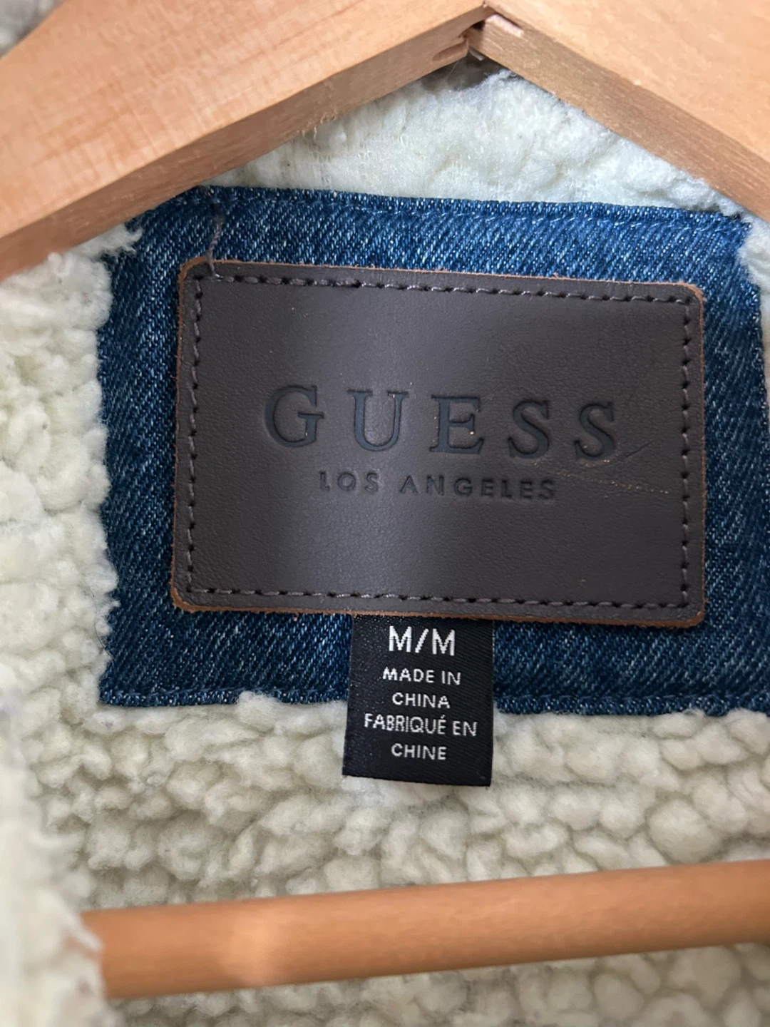 Cozy Guess denim jacket with a warm sherpa lining! It's in great condition and perfect for cooler weather. Size is M. There are a few small paint splatters on the sleeve, as pictured.