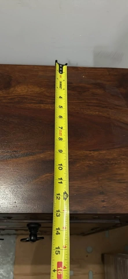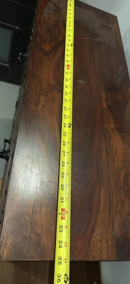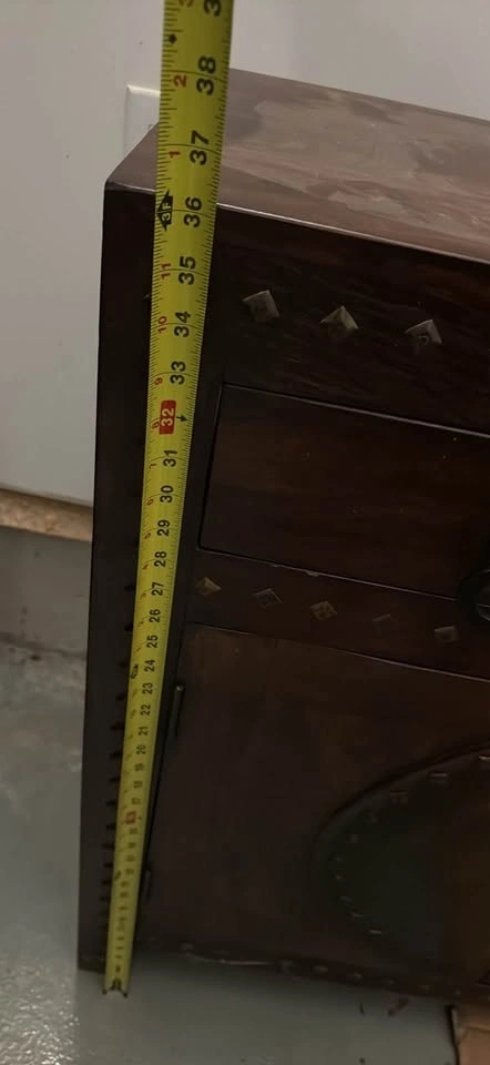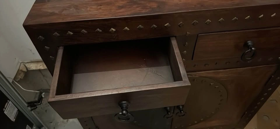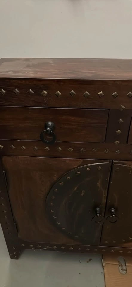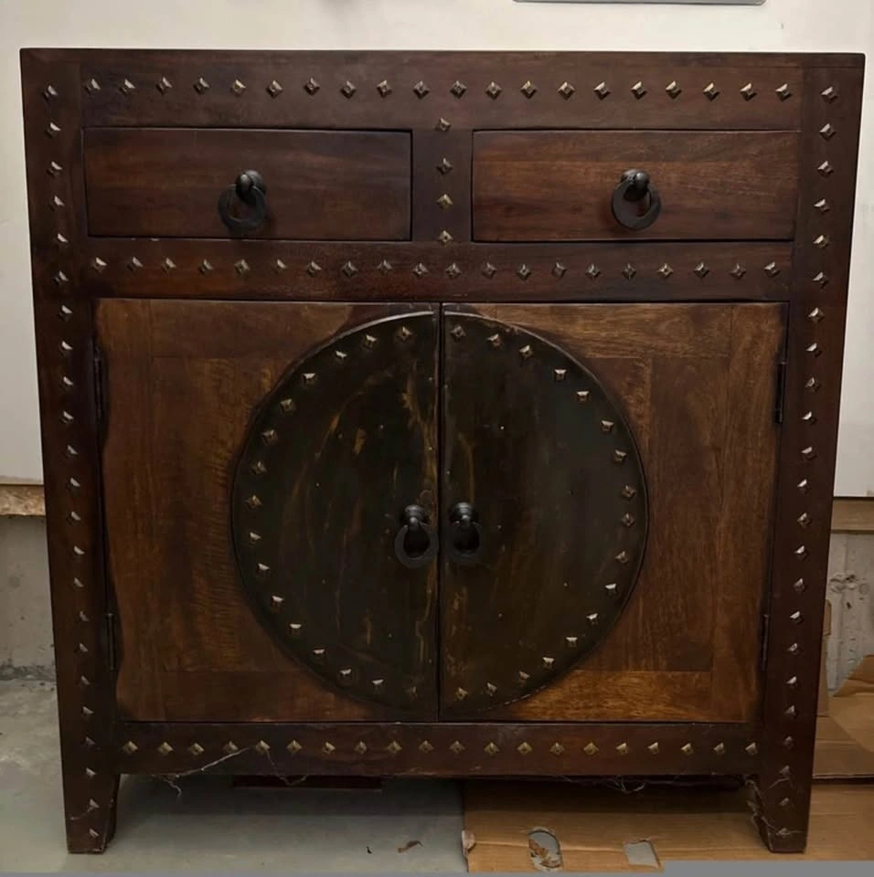 This is a stylish and unique accent cabinet, perfect for adding character to any room! This features two drawers and a cabinet area with a circular metal design, providing ample storage space. The dark wood finish and metal stud accents give it a rustic yet elegant look.