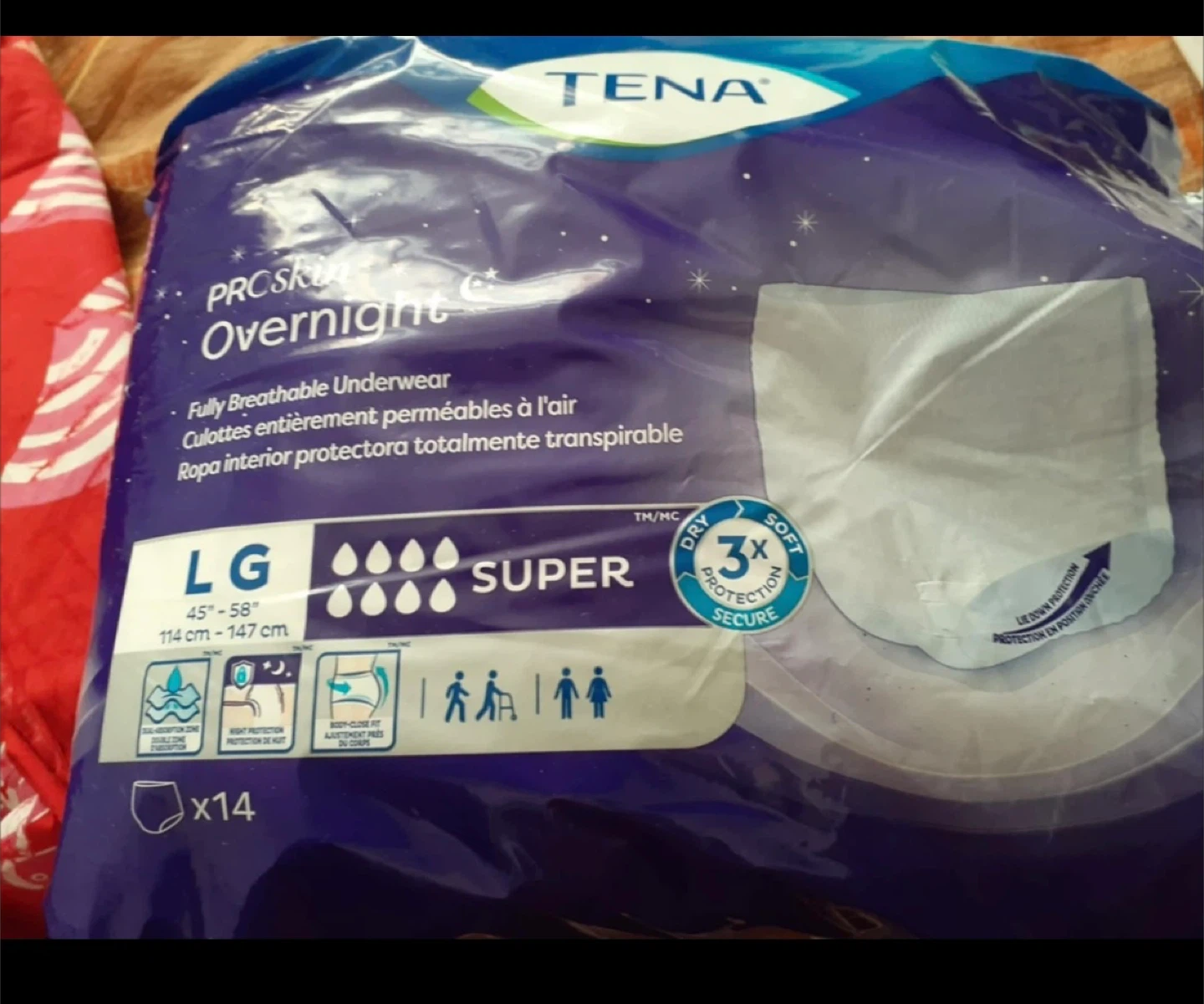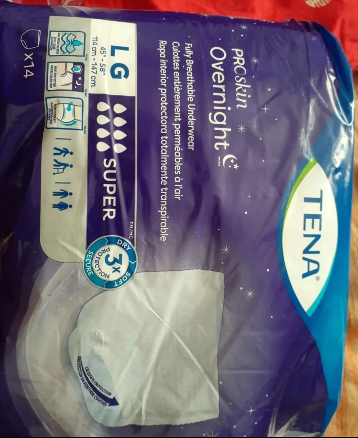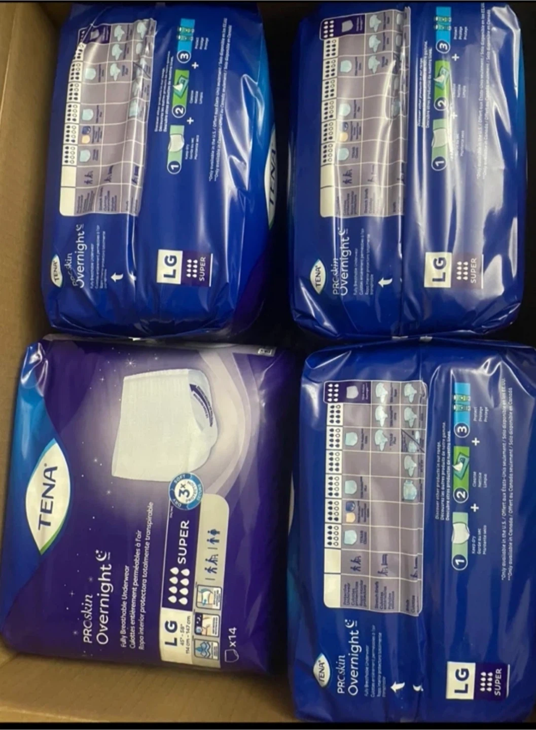 Selling TENA ProSkin Overnight Underwear in size Large with Super absorbency. These are fully breathable underwear designed for comfort and superior skin health. They fit waist sizes 45"-58" (114 cm - 147 cm). Each package contains 14 briefs.each box has 4 bags diapers as a box $65 or buy all of them 45 bags get discount no drop off only pick up by door Markham and Lawrence avenue east.