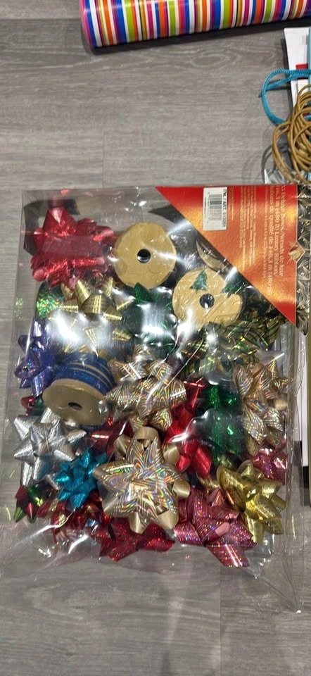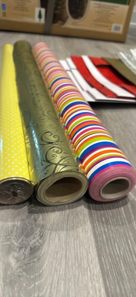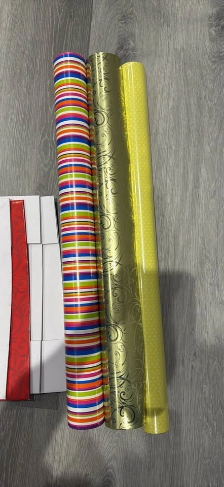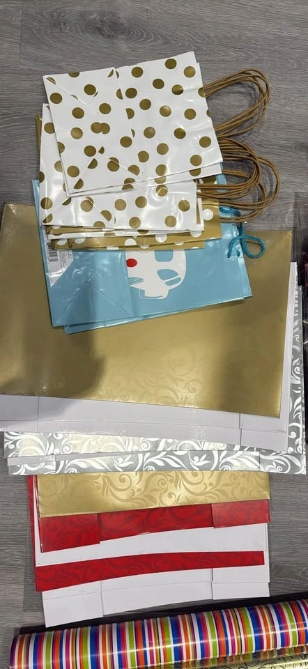 Get ready to wrap those presents with this gift wrapping lot! This lot includes a variety of wrapping paper sheets, rolls, gift bags, ribbons, and bows. Most of the items are new and unused, ready to add a special touch to your gifts. The items are in good condition, ensuring your presents look their best!