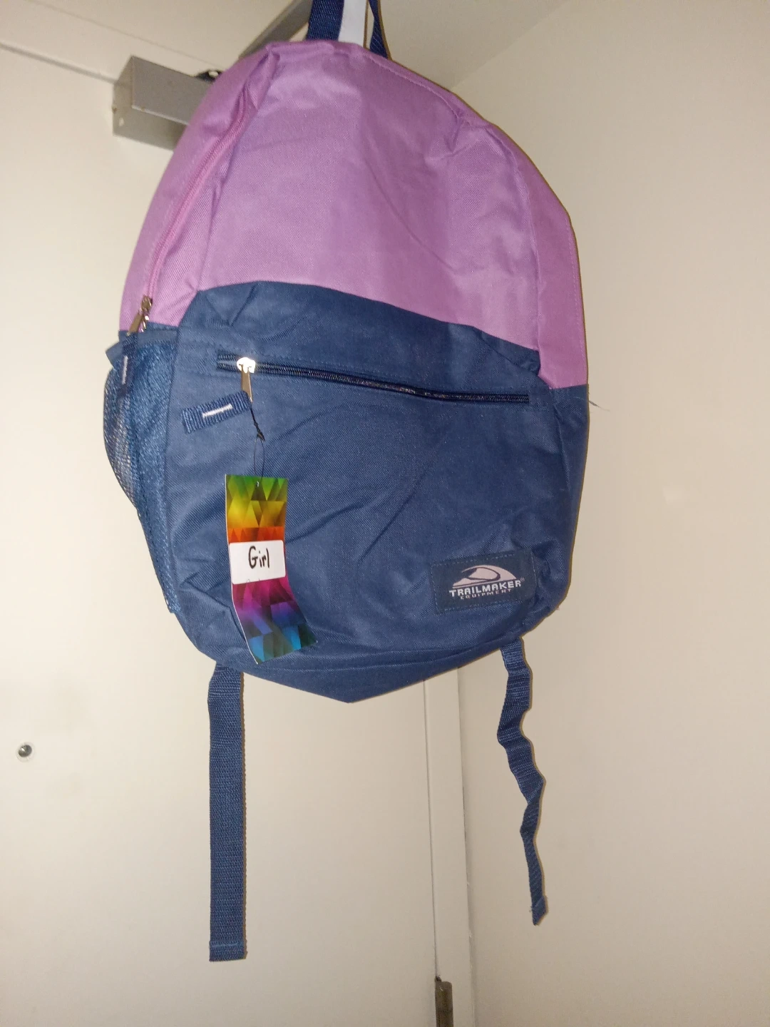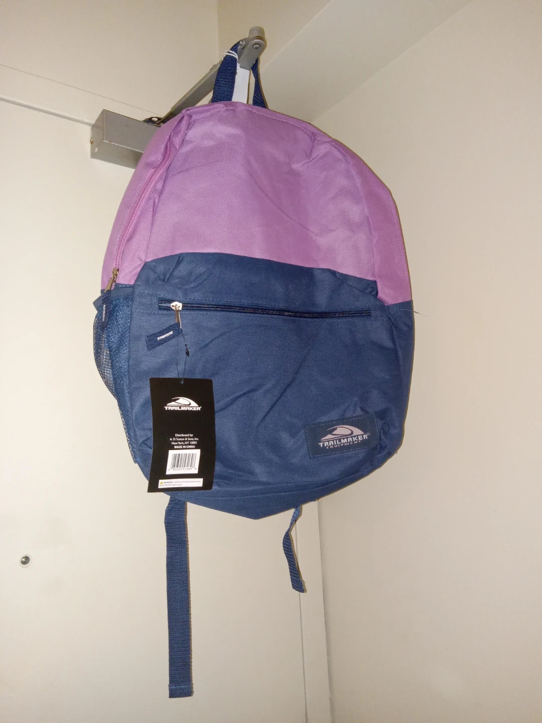 Here's a cute Trailmaker backpack for kids! It's a mix of blue and purple, perfect for school or outings. It's in great condition and ready for a new adventure!