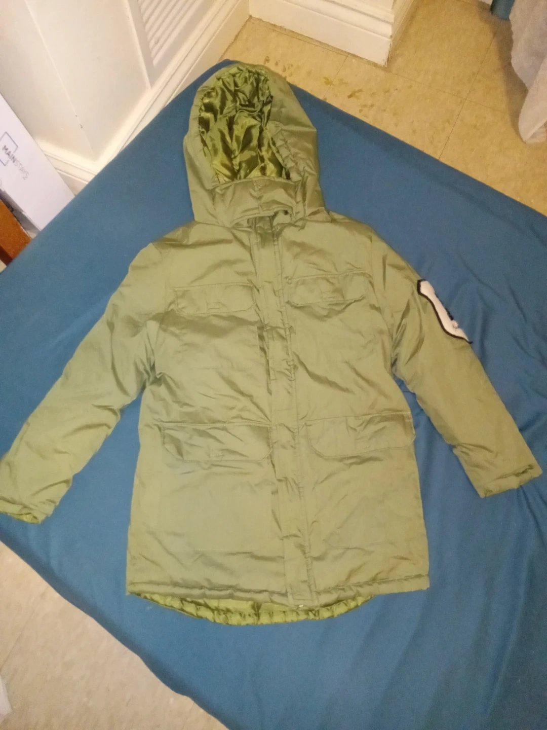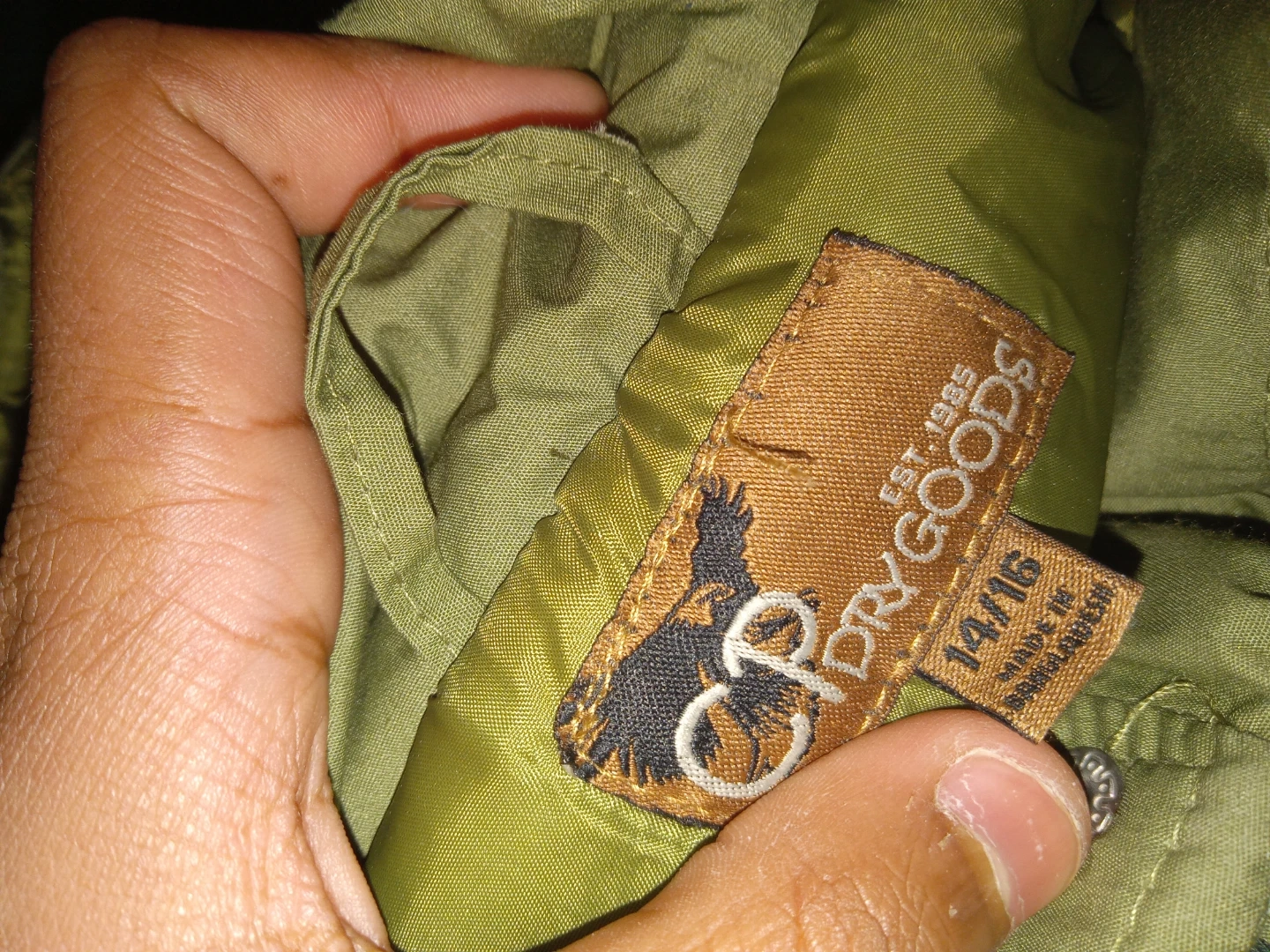 This is a Dry Goods puffer jacket in olive green. It's a size 14/16 and has a cool patch on the sleeve. Perfect for keeping warm during those chilly days!