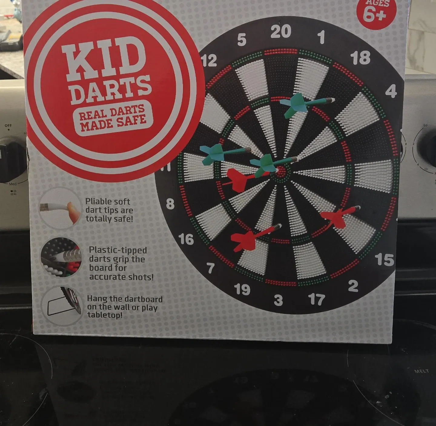 Selling a Kid Darts set! It's designed with soft, pliable dart tips for safety. The plastic-tipped darts grip the board well for accurate shots. You can hang the dartboard on the wall or play on a tabletop. Suitable for ages 6+