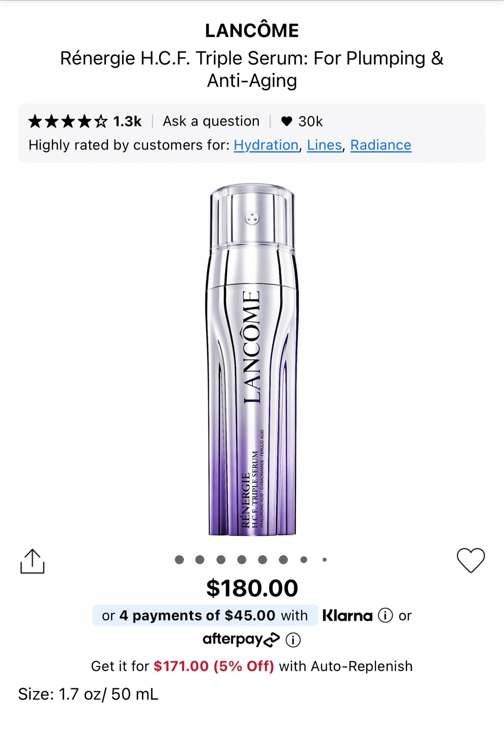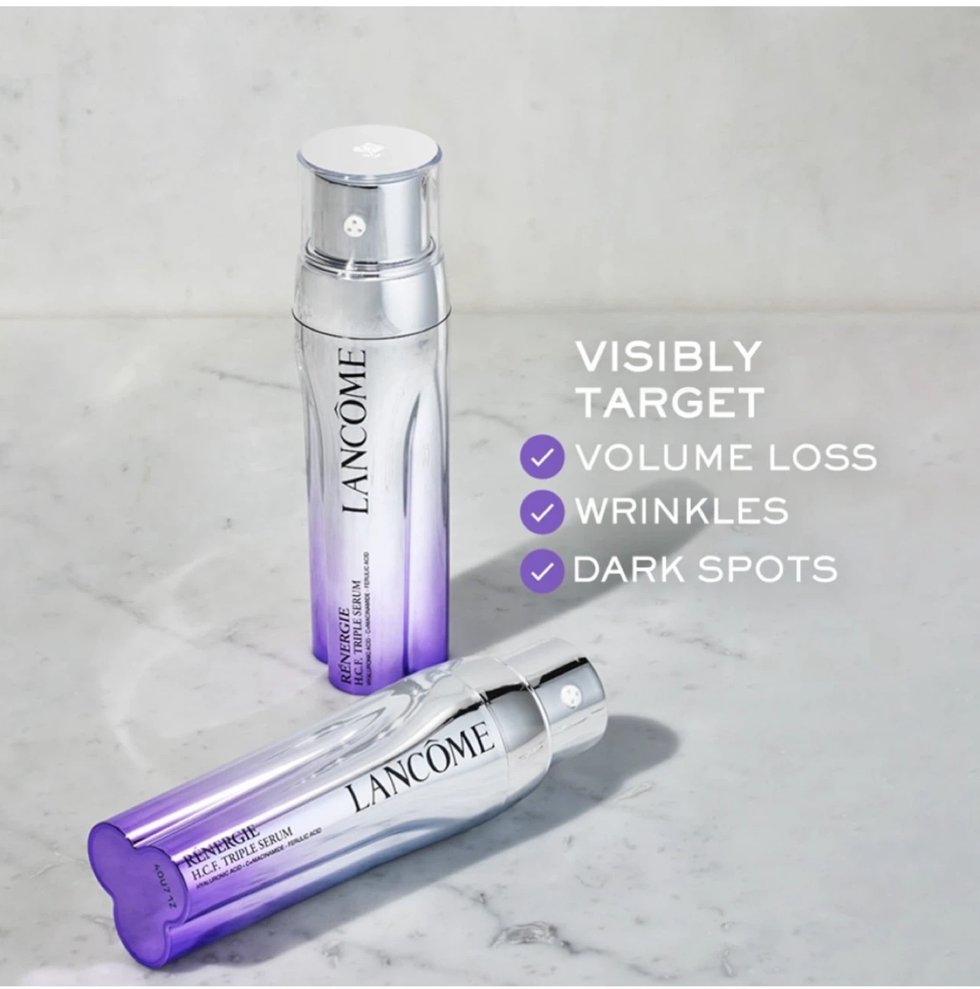 Selling a Lancôme Rénergie H.C.F. Triple Serum. It's for plumping and anti-aging! This serum is highly rated by customers for hydration, lines, and radiance. It visibly targets volume loss, wrinkles, and dark spots. It contains hyaluronic acid to plump and smooth, vitamin C+ niacinamide to visibly reduce dark spots, and ferulic acid, an antioxidant known for skin-protecting properties. Size: 1.7 oz/ 50 mL