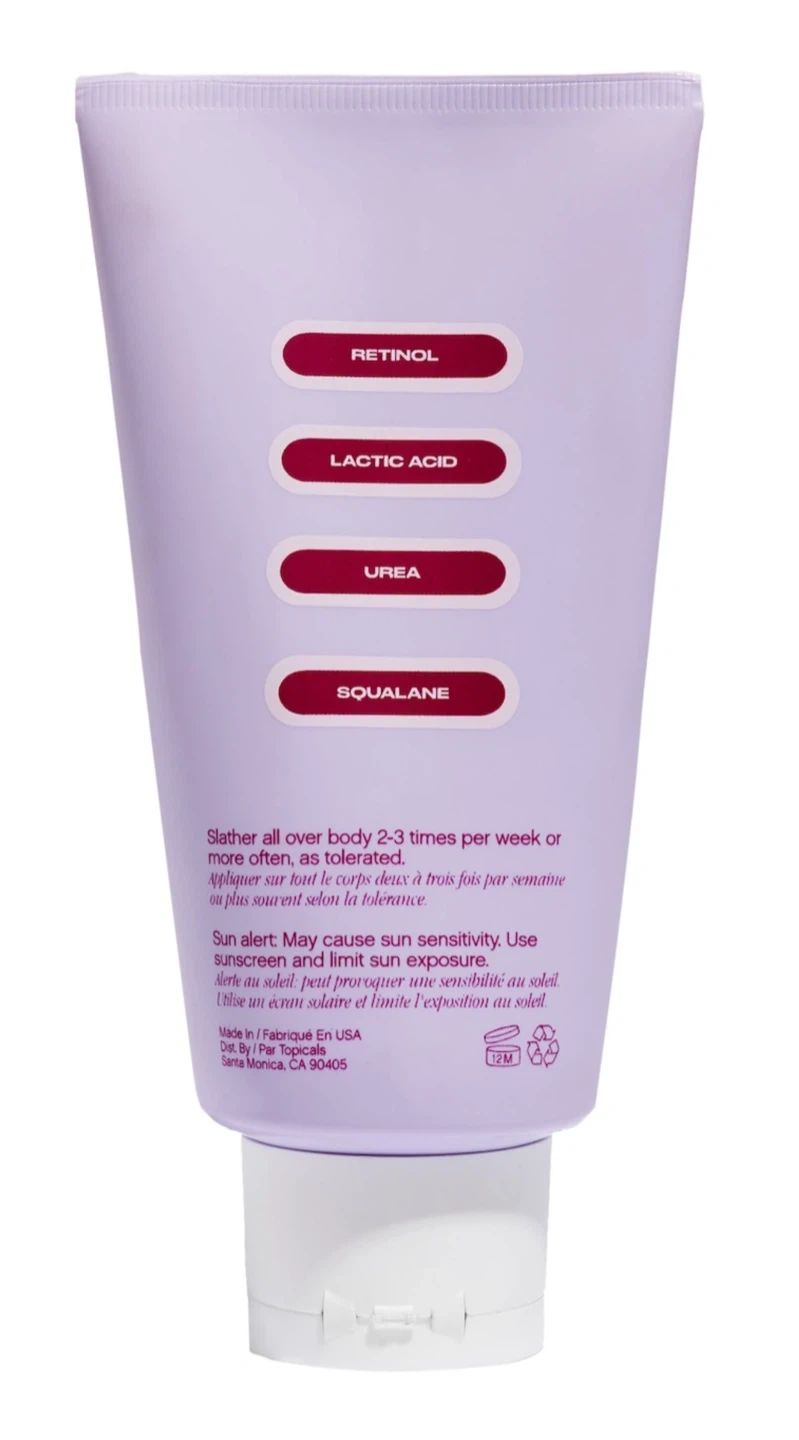 Selling a Topicals Slather Exfoliating Body Serum! This serum comes in a 150ml / 5 fl oz tube and is designed for textured skin. It contains retinol, lactic acid, urea, and squalane to help resurface rough skin texture and improve firmness and tone. Use 2-3 times per week for best results!