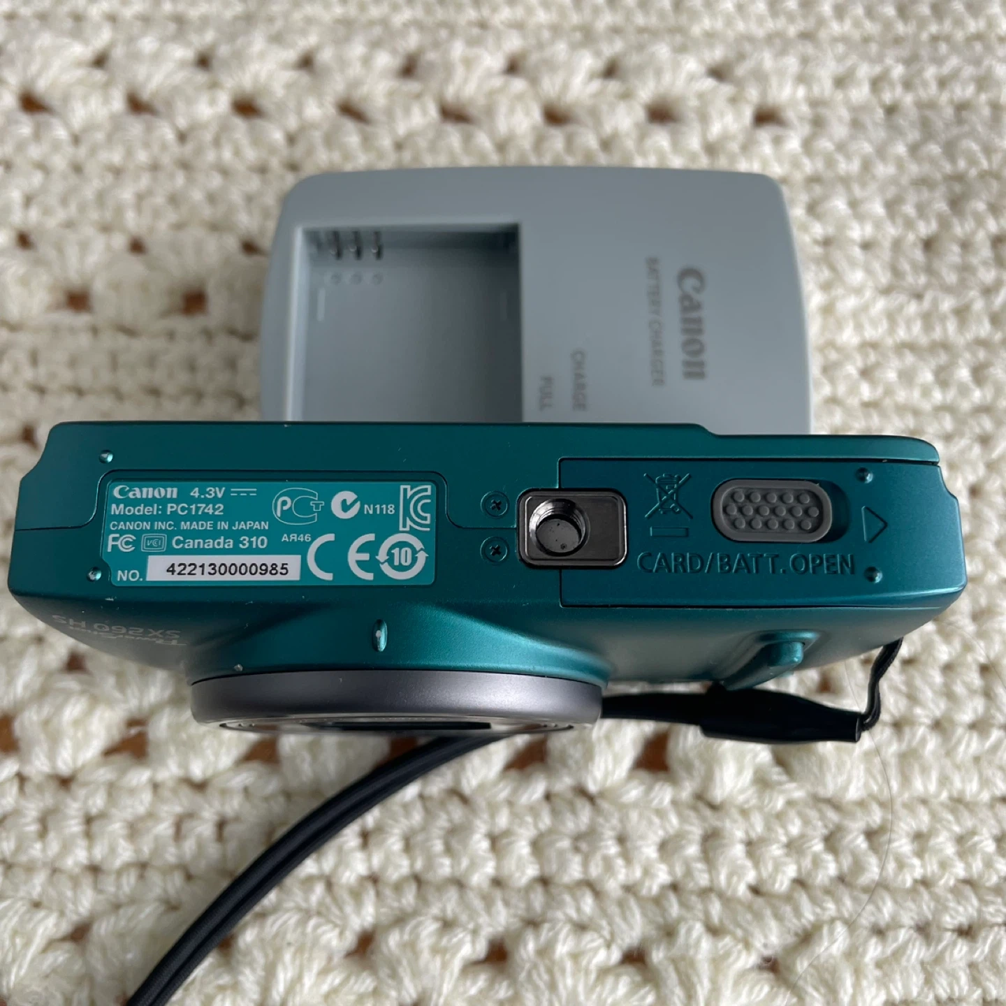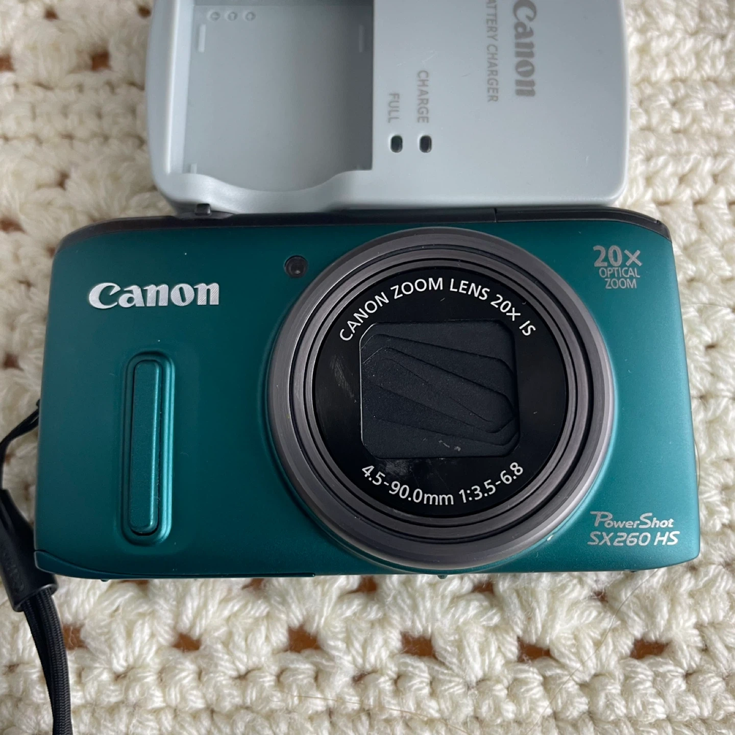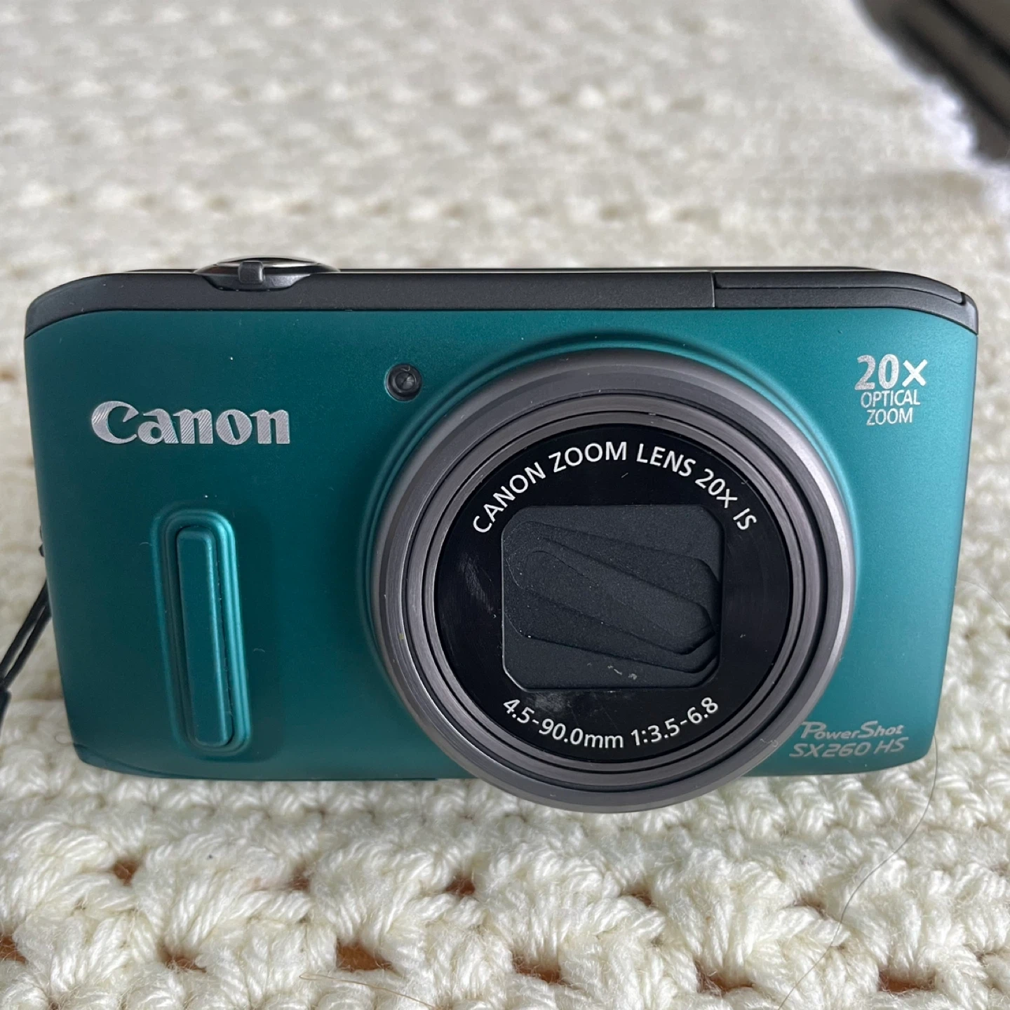 Selling a Canon PowerShot SX260 HS digital camera in a nice teal colour! It comes with the battery charger. This camera features a 20x optical zoom lens and is in good working condition. Great for travel or everyday use!