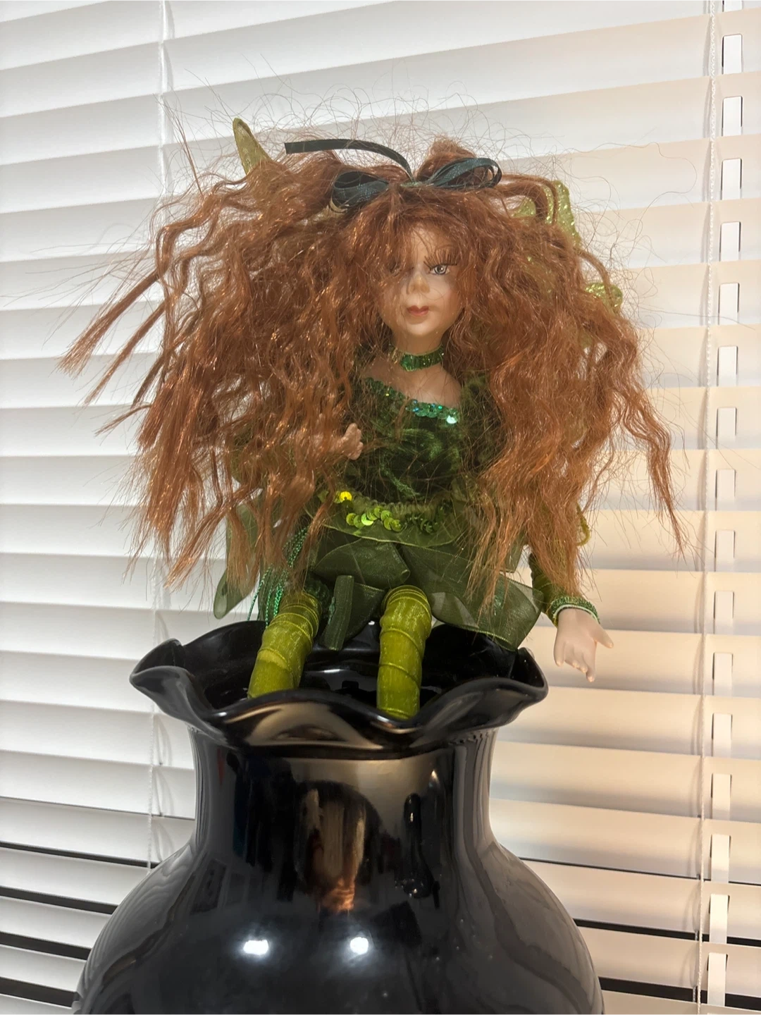 doll Figurine with red hair and a green dress. It's in good condition! These tend to sell I. The 60-80.00 prices t