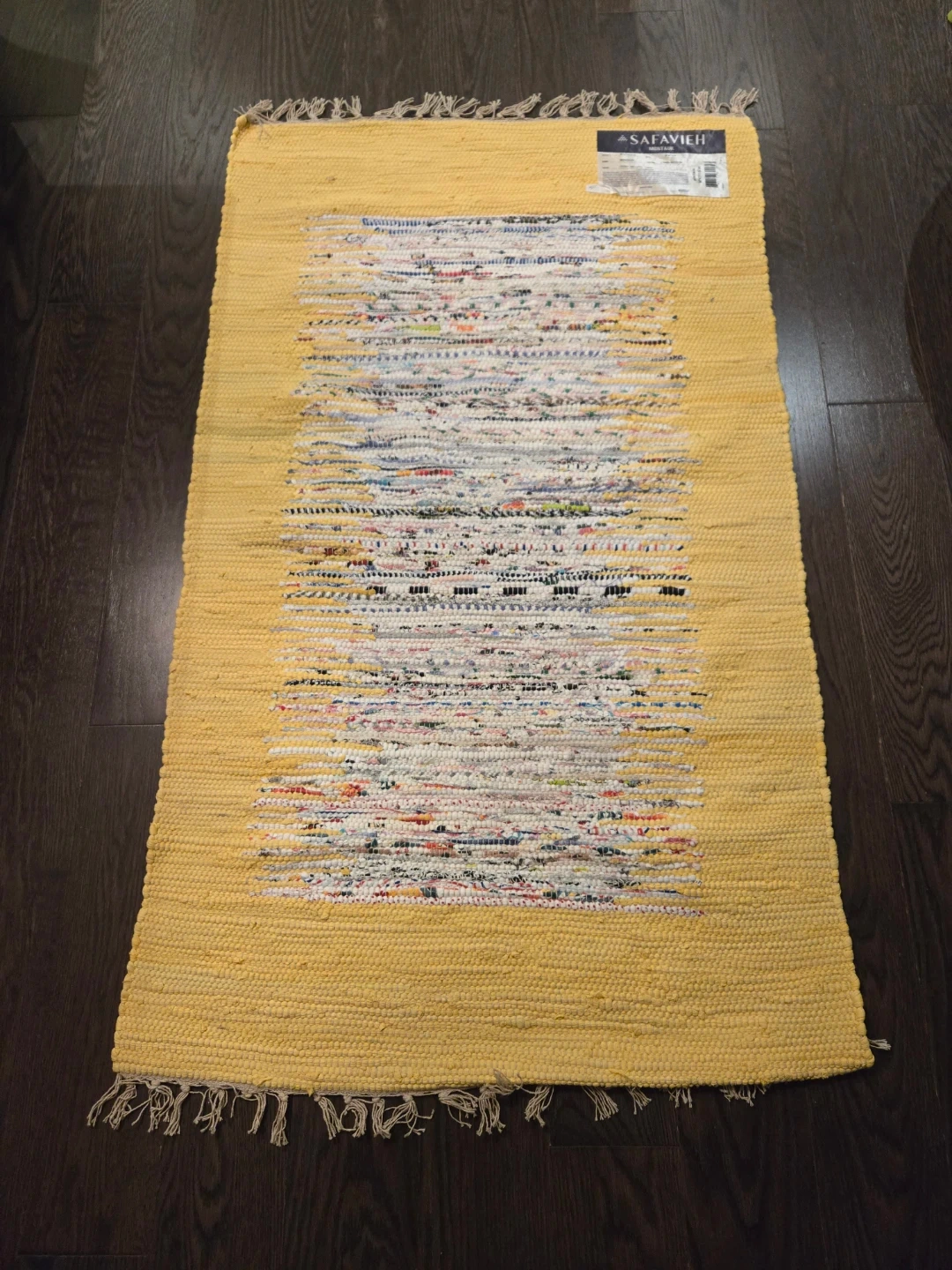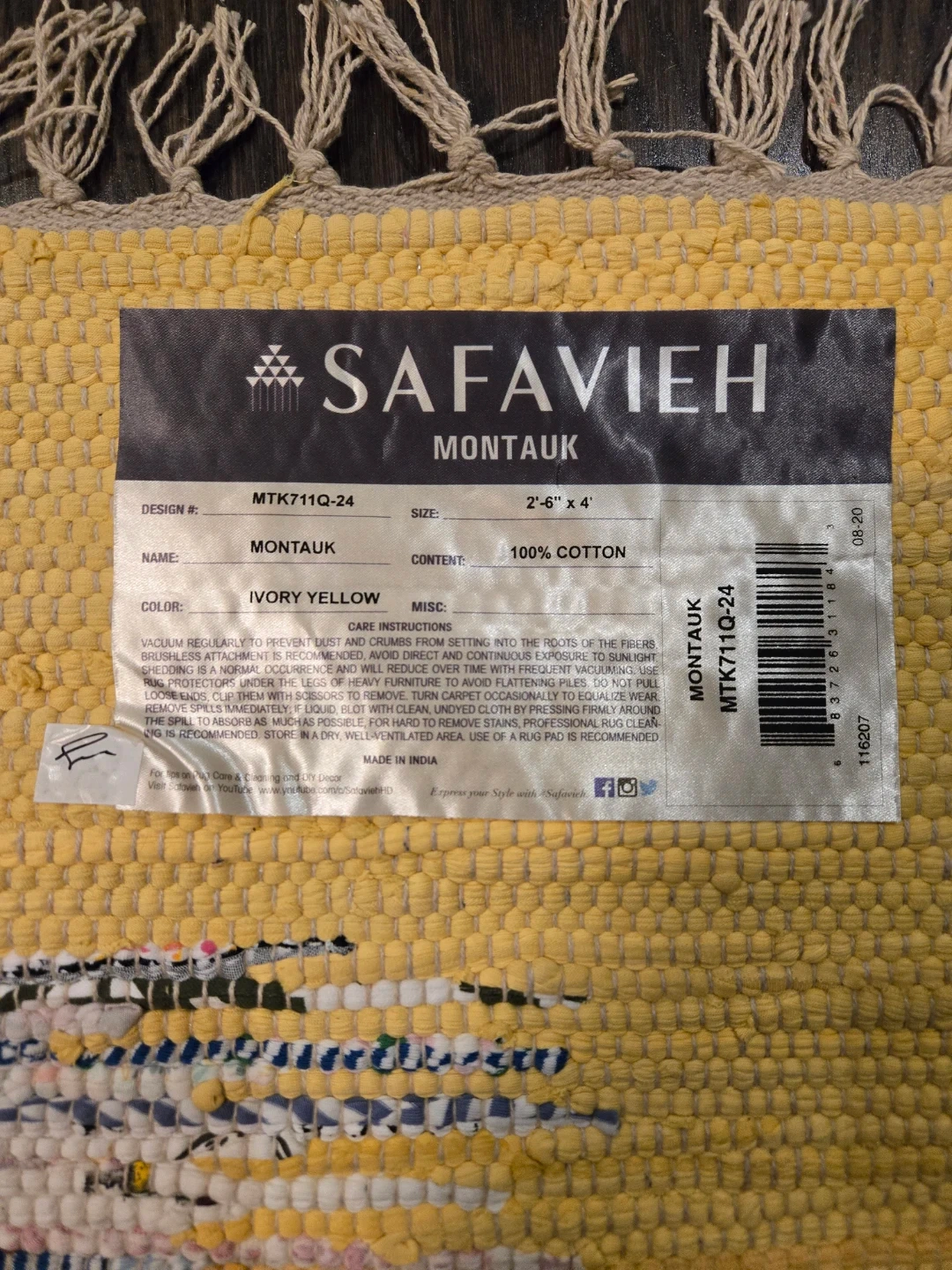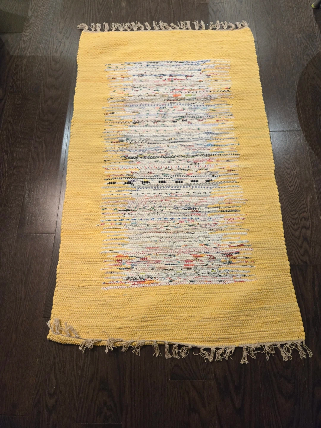 Purchased from Wayfair. 2'6" x 4" cotton rug made of 100% cotton. It was placed underneath a clothing bench for a few months.