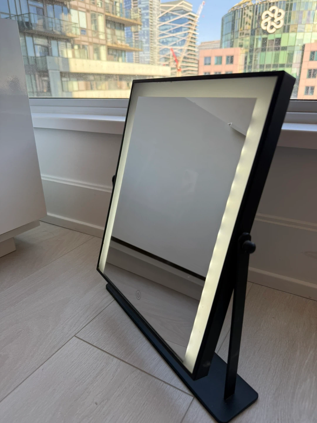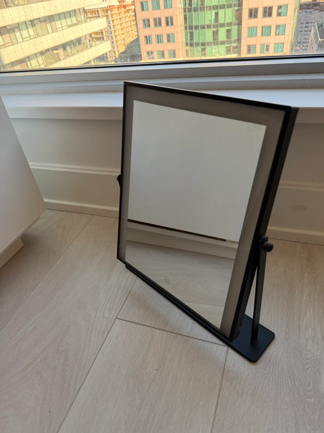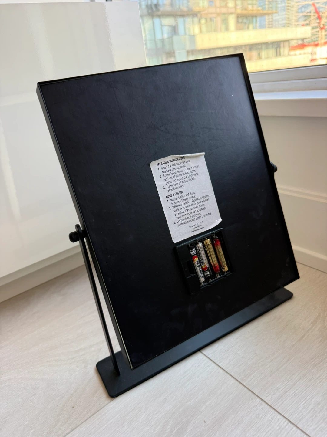 Selling a makeup mirror! It has LED lights around the edge. It requires 4 AAA batteries, which are included. This mirror is in great condition and perfect for getting ready