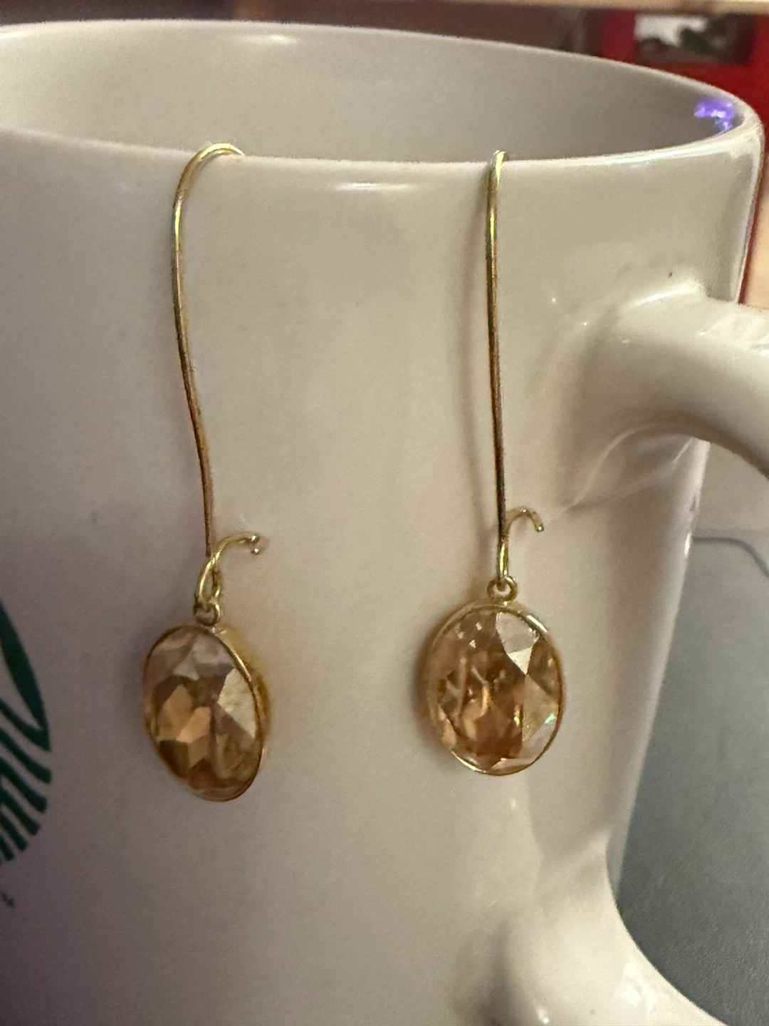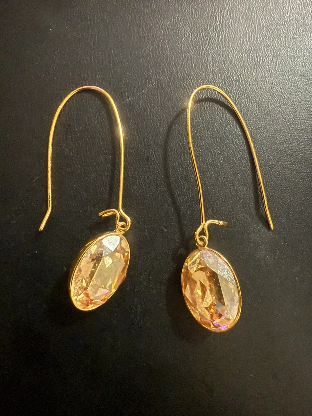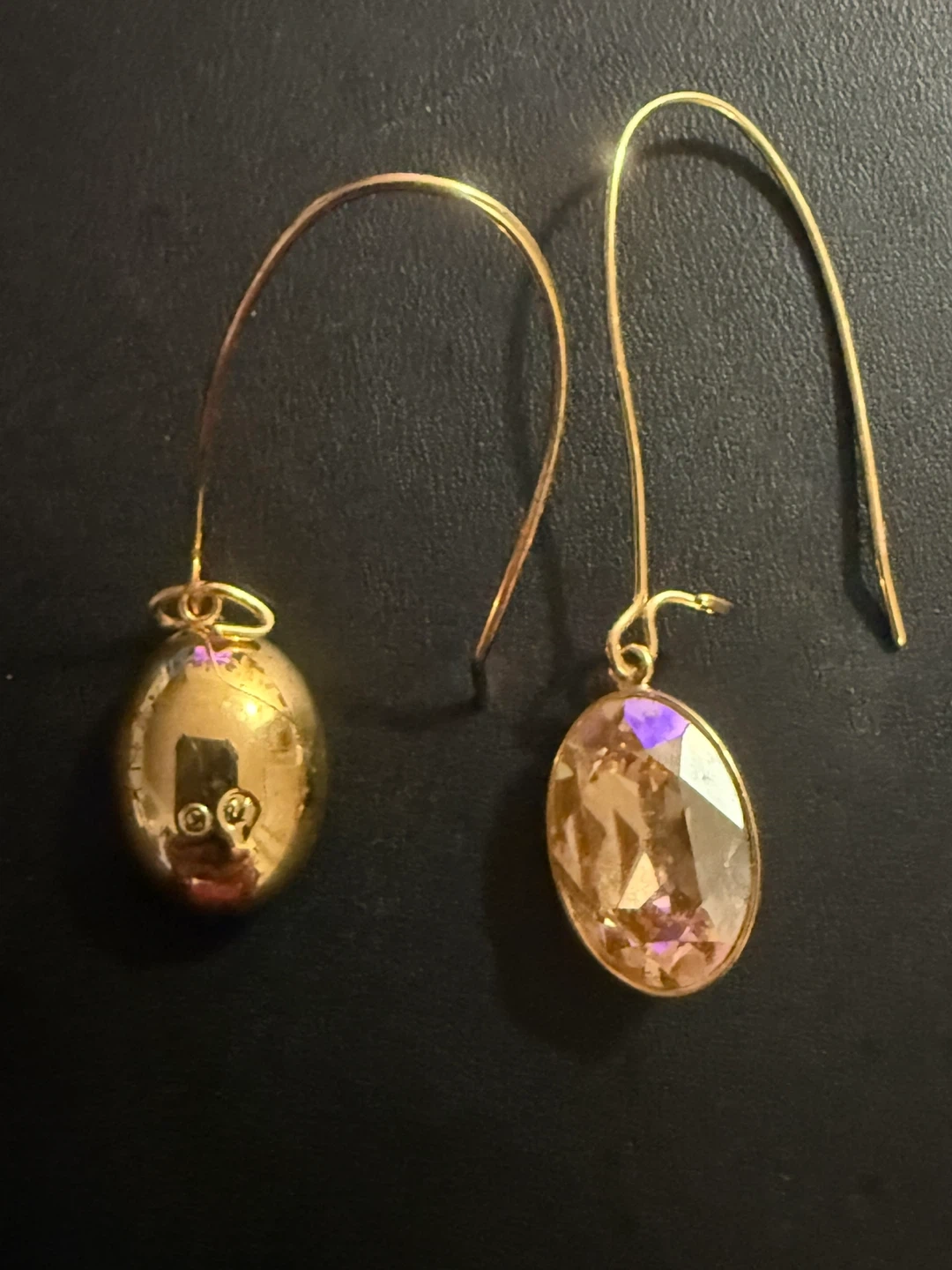 These are a pair of gold tone drop earrings. One earring has a round gold charm and the other has an oval peach-colored charm. They are in good condition!