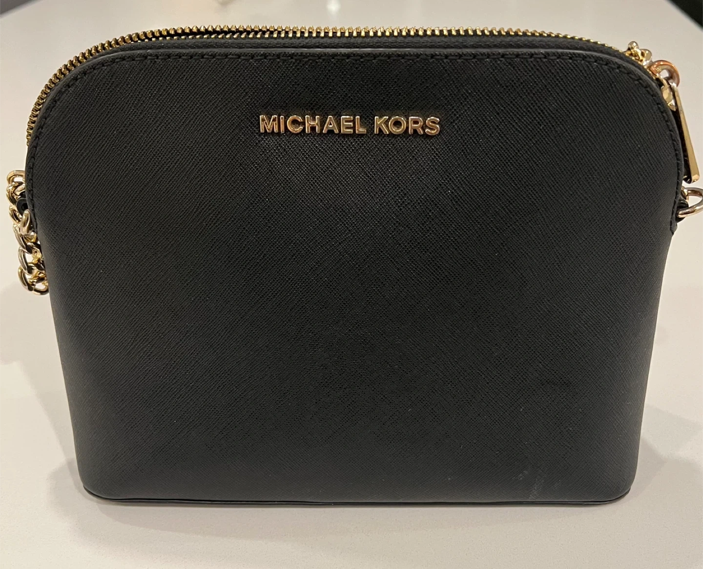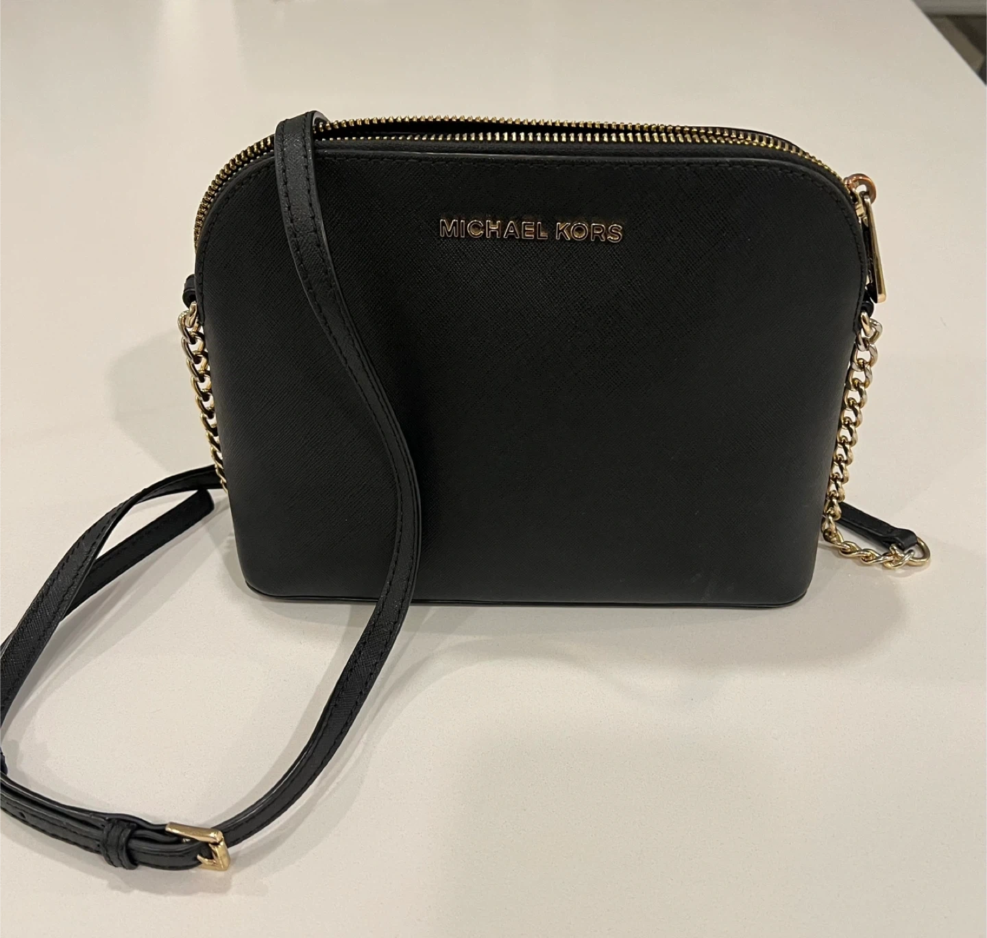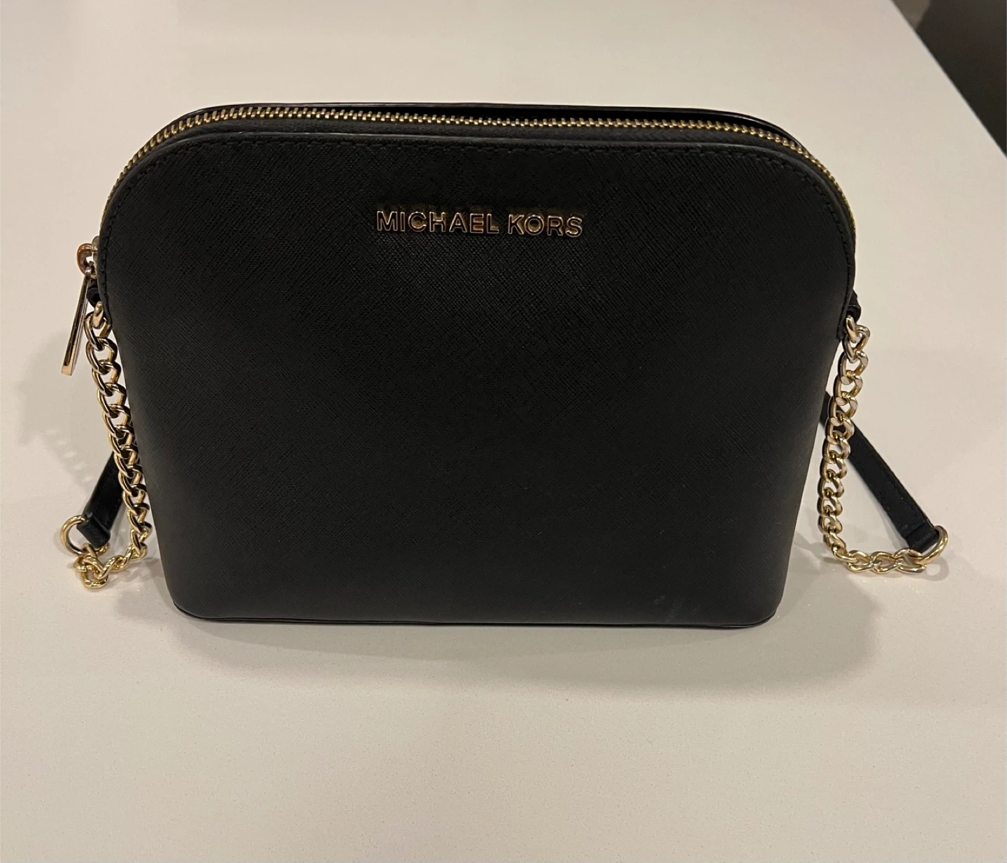 Selling a Michael Kors crossbody bag in black. It's in great condition and ready for a new owner! The bag features a gold-tone chain strap and the Michael Kors logo on the front. Perfect for everyday use or a night out