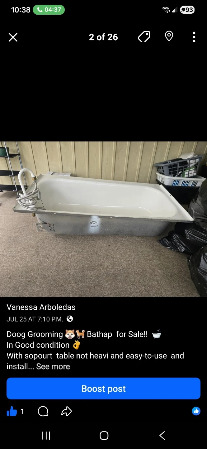 Selling a used dog grooming bathtub in good condition. It includes a support table. It's not too heavy and is easy to use and install. Perfect for grooming your furry friends at home!