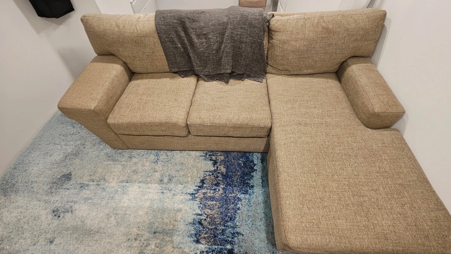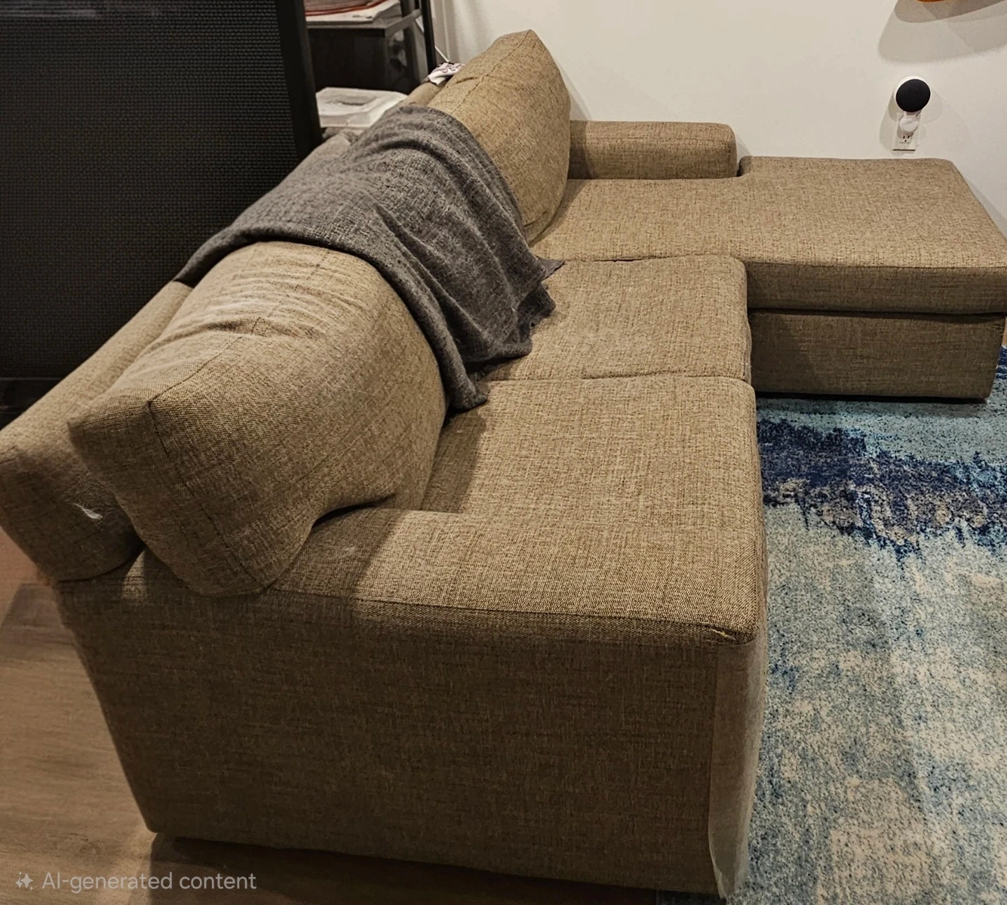 Pick up this comfy sectional sofa in a neutral beige colour. It features a modular chaise lounge for extra relaxation. It's in good condition with some scratch damage from cats and would be a perfect addition to any living room!