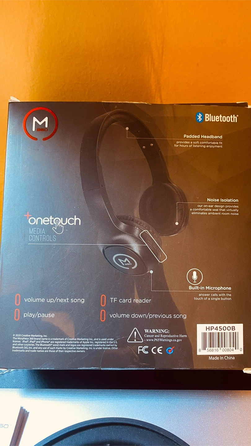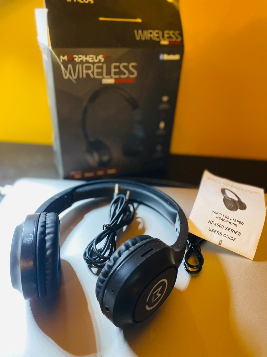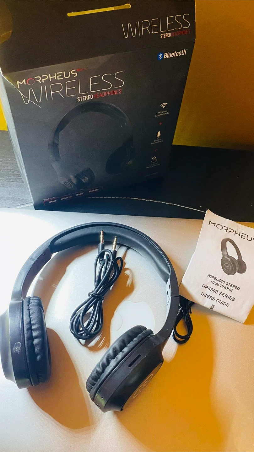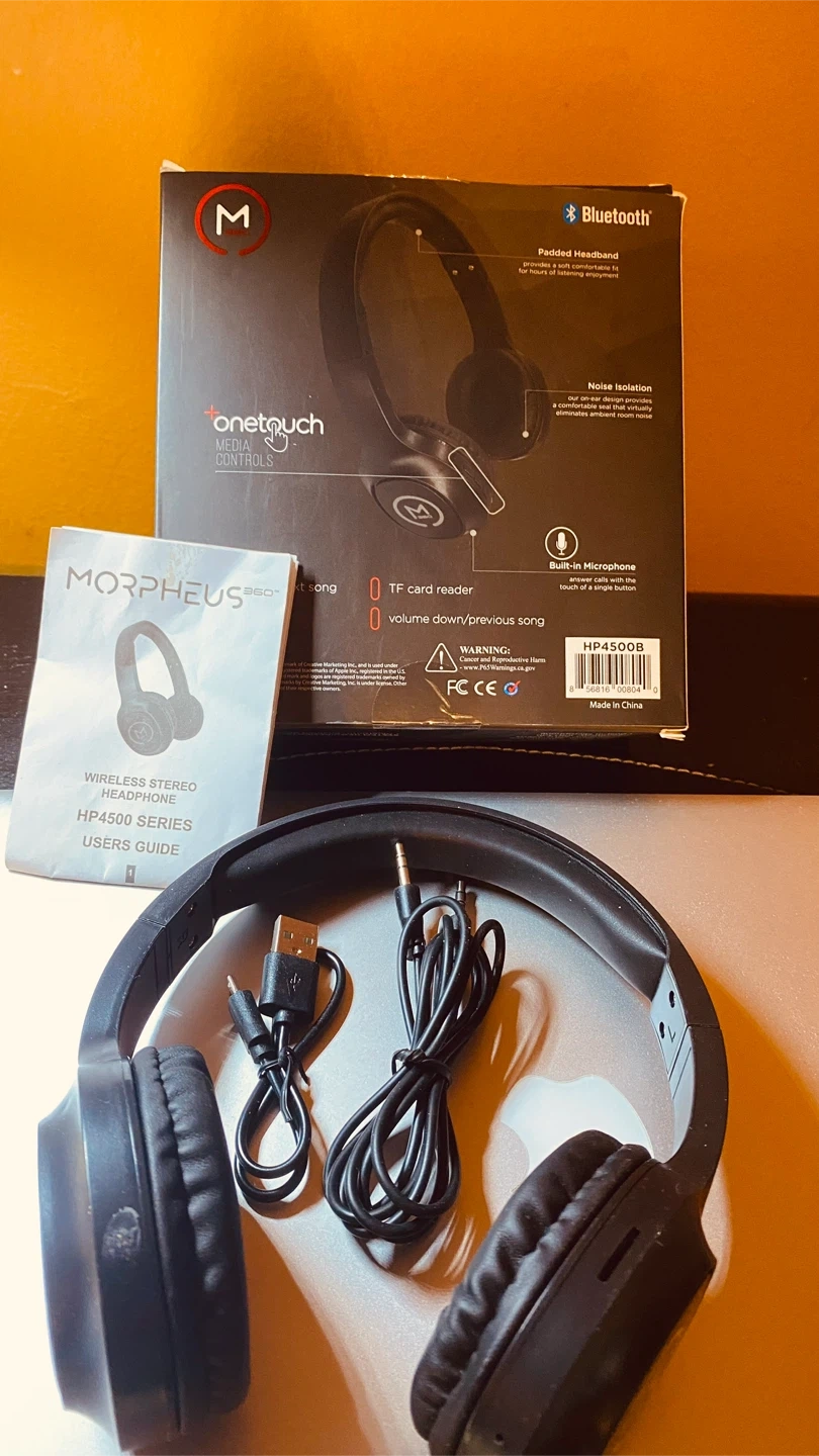 Selling a pair of Morpheus wireless stereo headphones, model HP4500B. They feature Bluetooth connectivity, a built-in microphone, and noise isolation for a comfortable listening experience. The headphones have onetouch media controls, including volume up/next song, play/pause, and volume down/previous song. Also has a TF card reader. Comes with the original box and user guide!