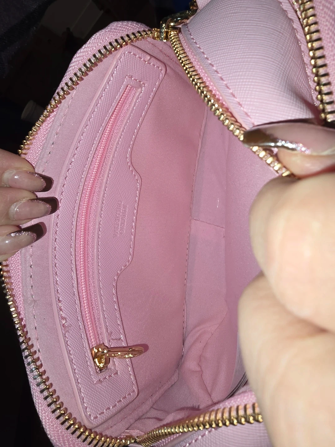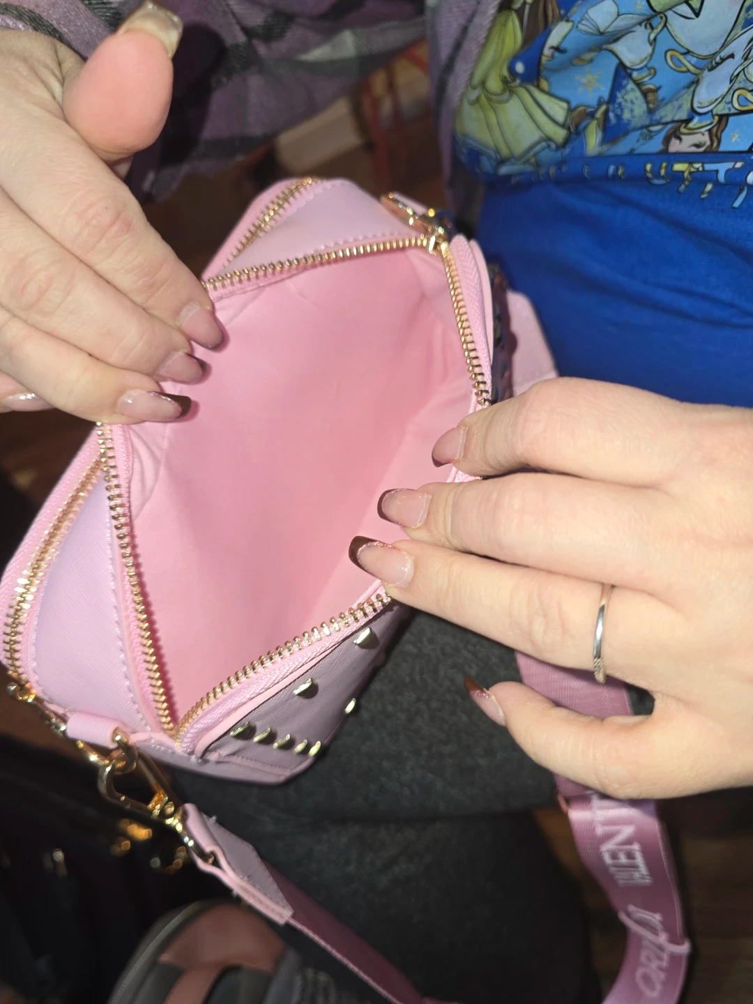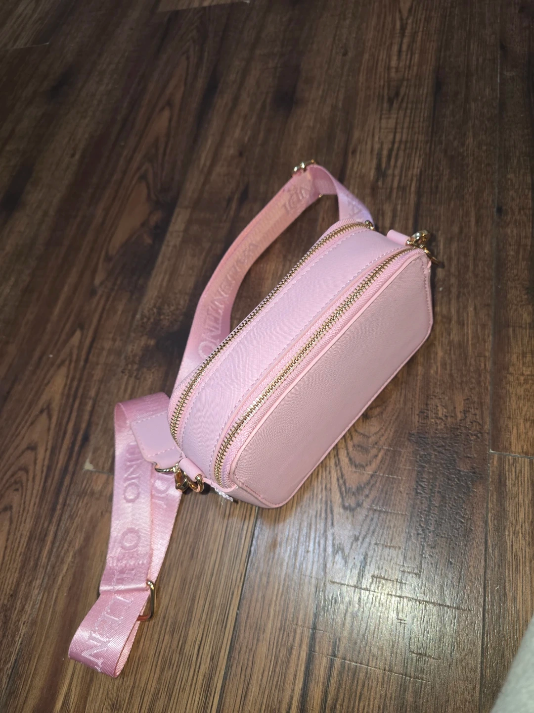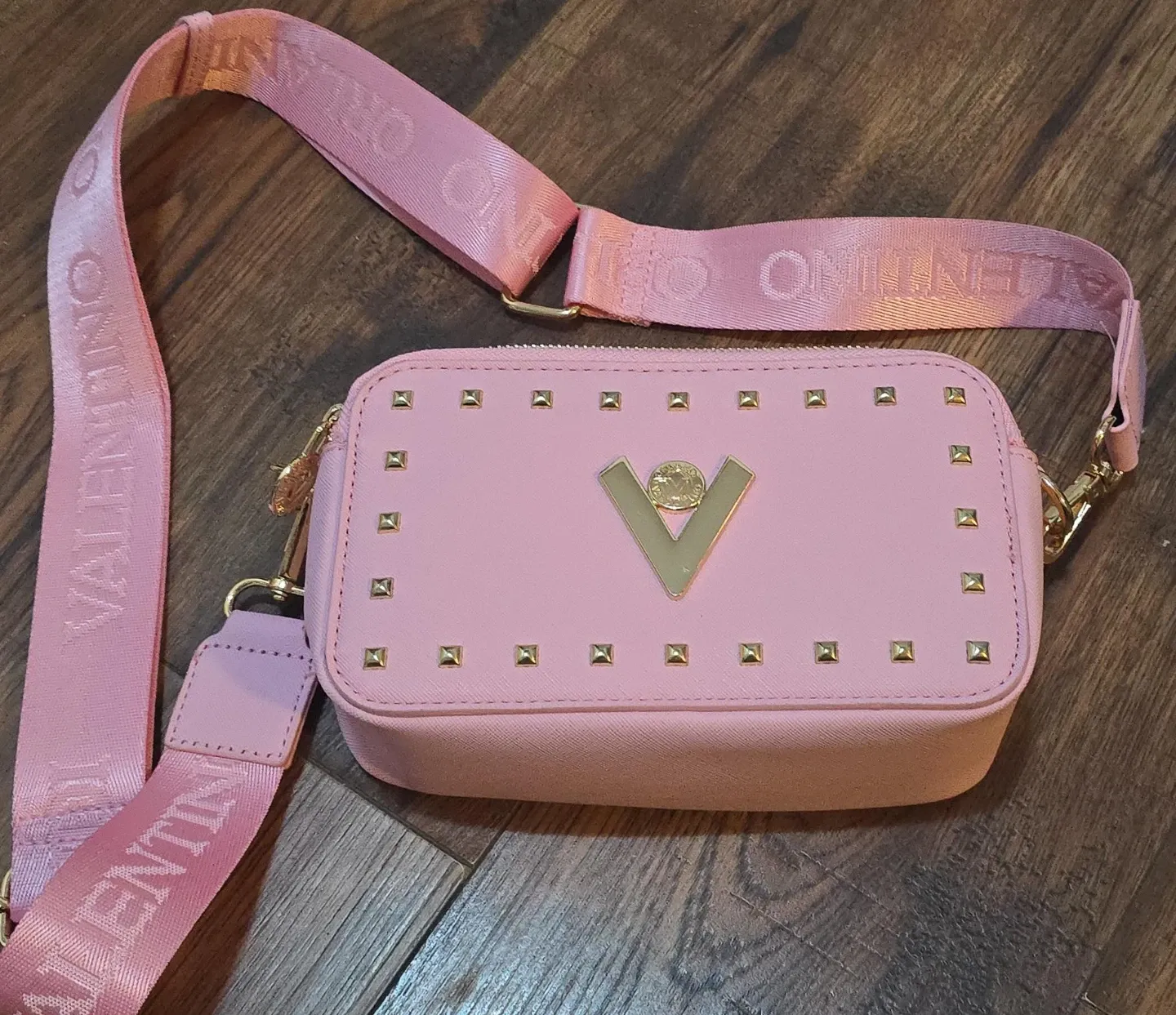 Selling a cute official Valentino Orlandi crossbody bag! It's a lovely shade of pink and has a stylish design with gold-tone hardware and a studded accent. The strap is also pink and features the Valentino Orlandi name. Perfect for adding a pop of color to your outfit!