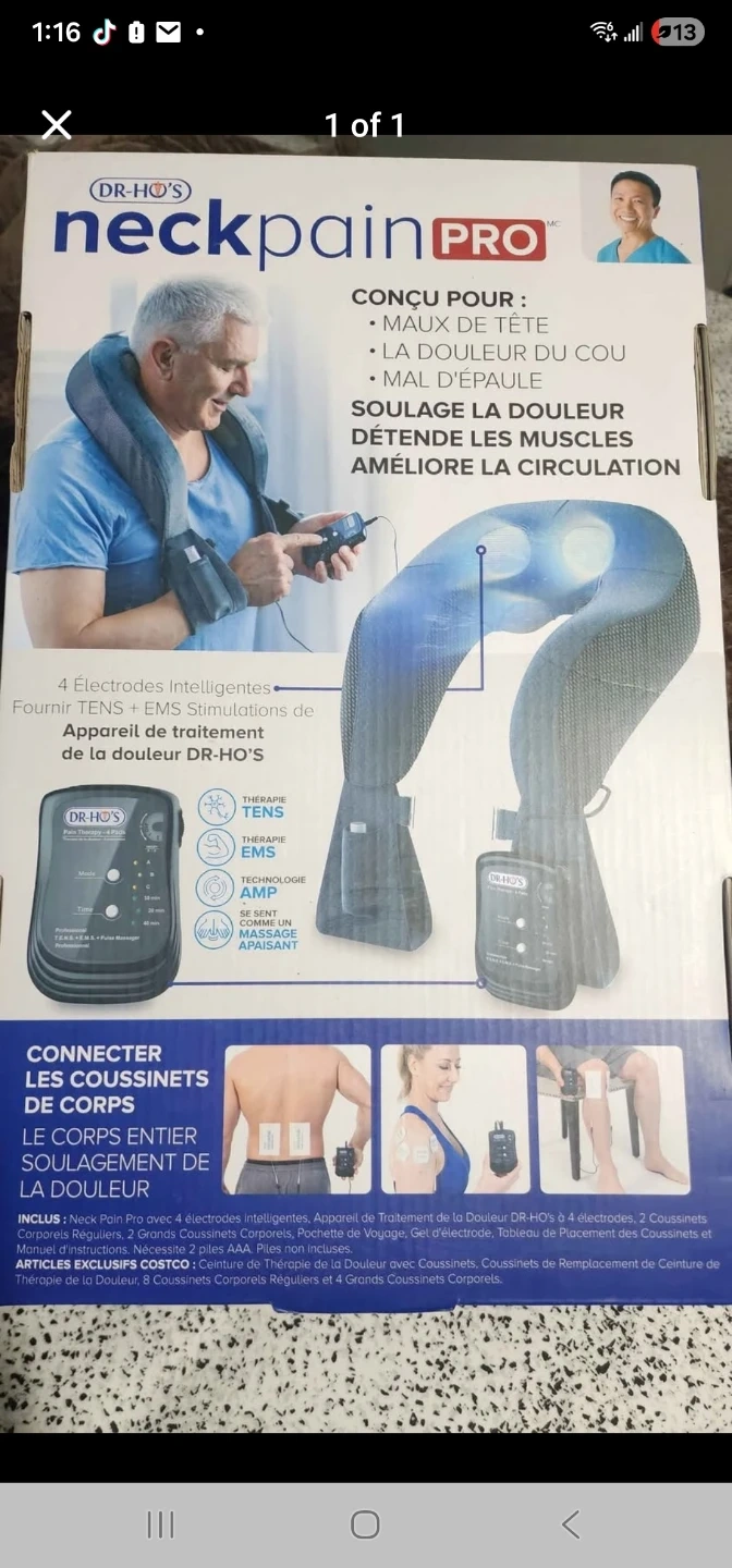 Selling a DR-HO'S Neck Pain Pro. It comes with 4 intelligent electrodes and provides TENS + EMS stimulation for pain relief. The device includes regular and large body pads, a travel pouch, electrode gel, pad placement chart, and instruction manual. Please note that it requires 2 AAA batteries, which are not included