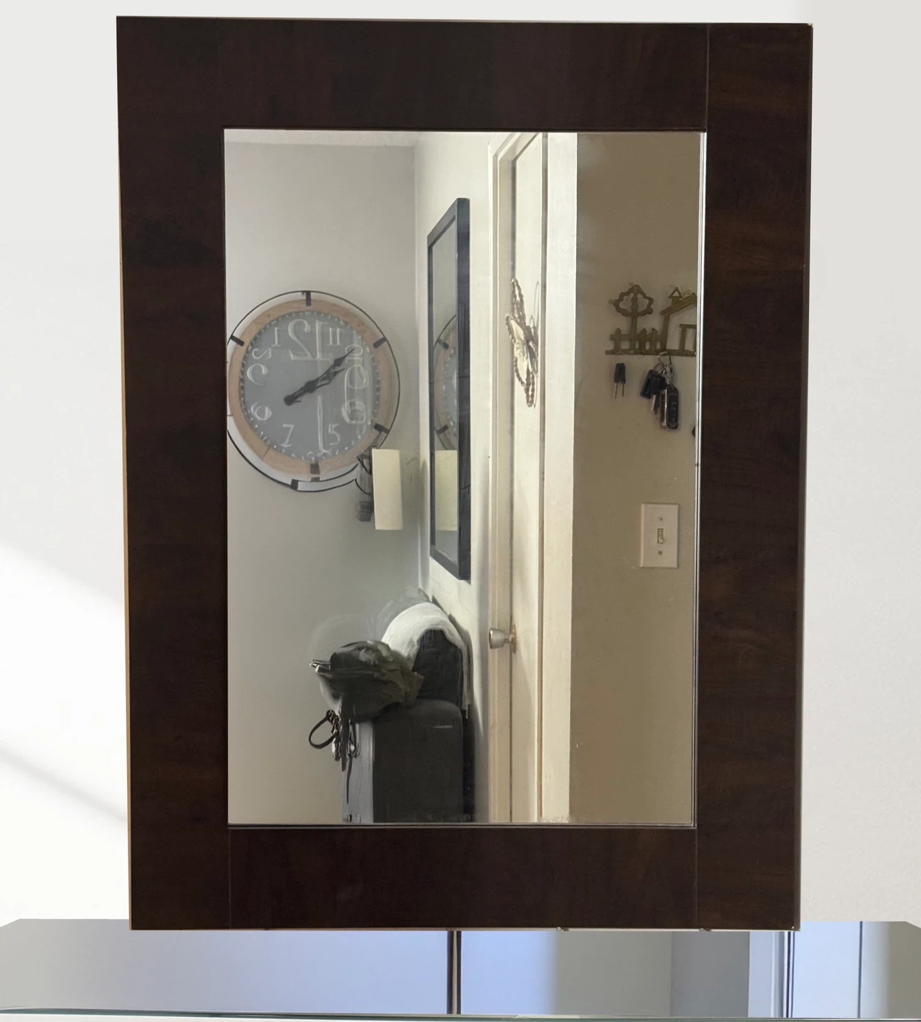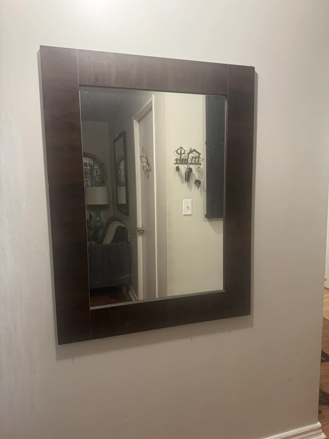 Selling a wall mirror with a dark brown frame. It's in perfect condition and would look great in an entryway or living room. The frame has a nice dark brown mohagny wood.