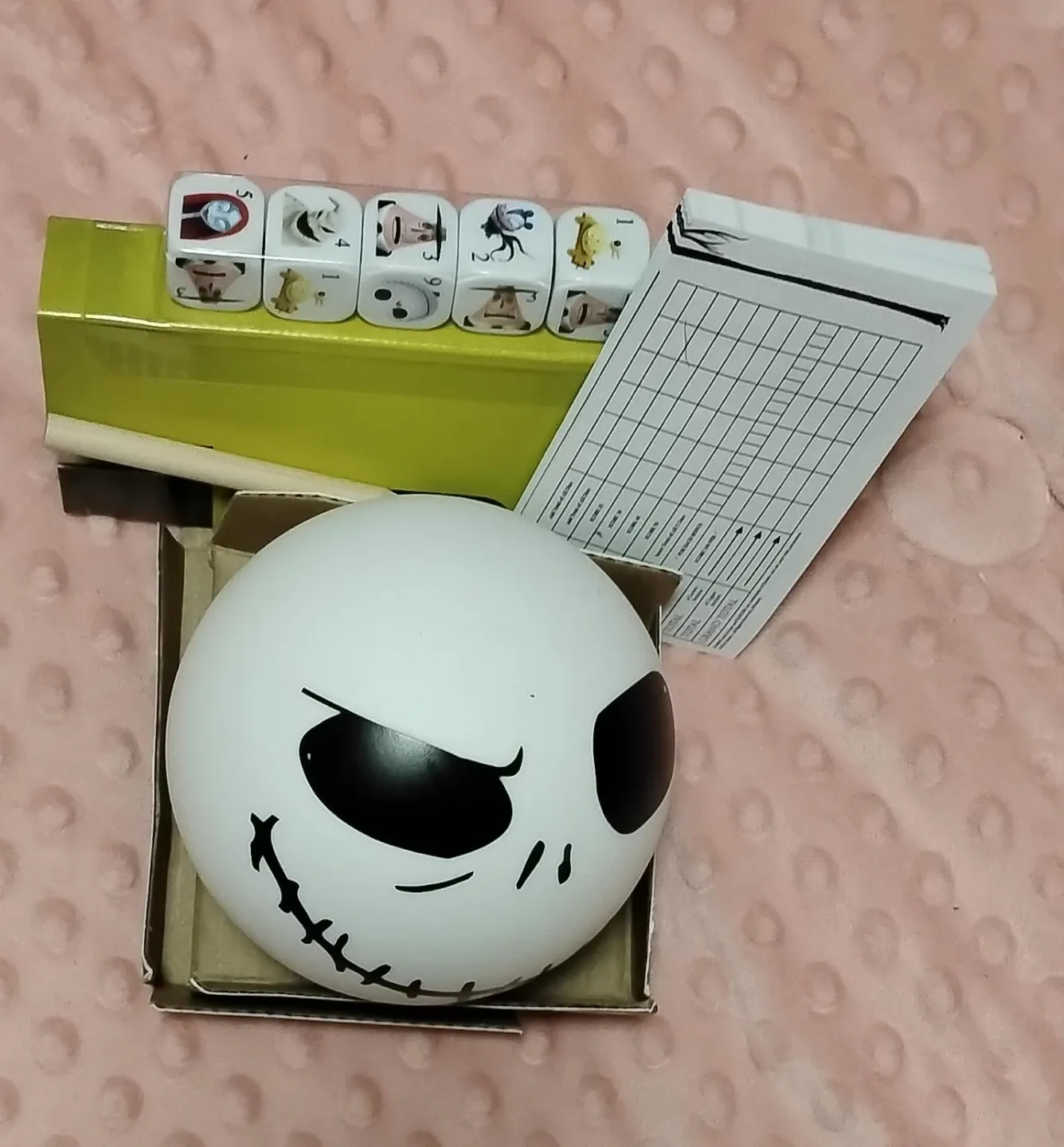 Selling a Nightmare Before Christmas themed Yahtzee game! It comes with a Jack Skellington dice cup, custom dice with character faces, and score sheets. The box is included.