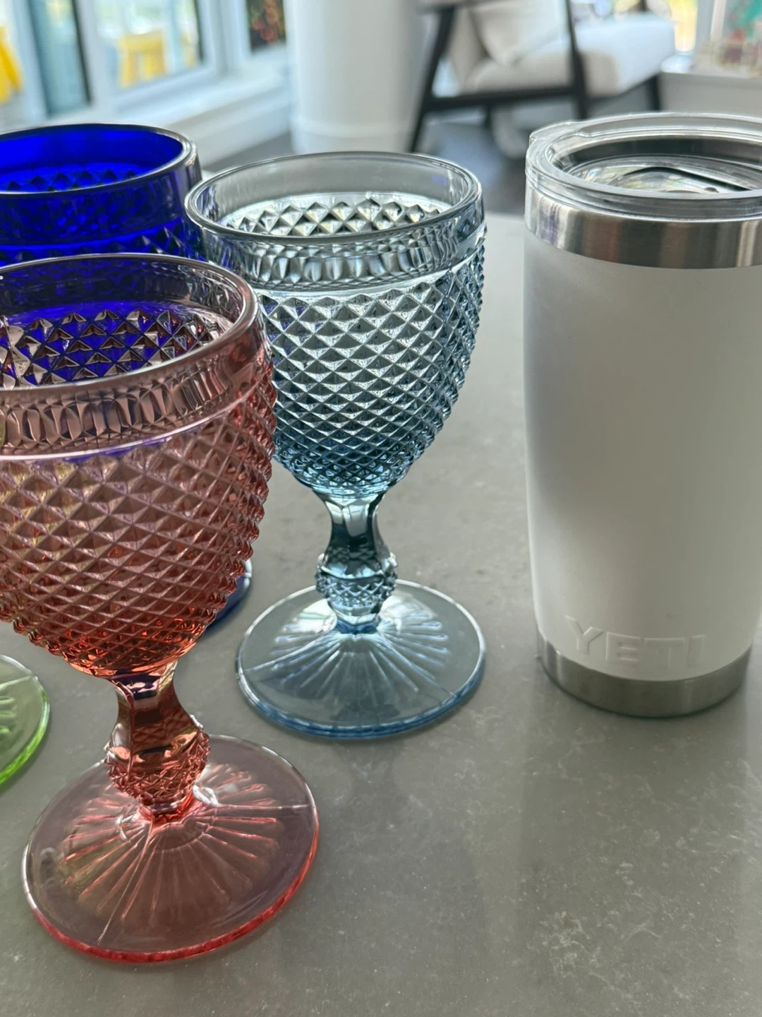 Here are 4 beautiful diamond cut footed glasses, made in Portugal! They come in a variety of colours: green, blue, light blue, and pink. They'd be a lovely addition to any table setting. It’s NEW.