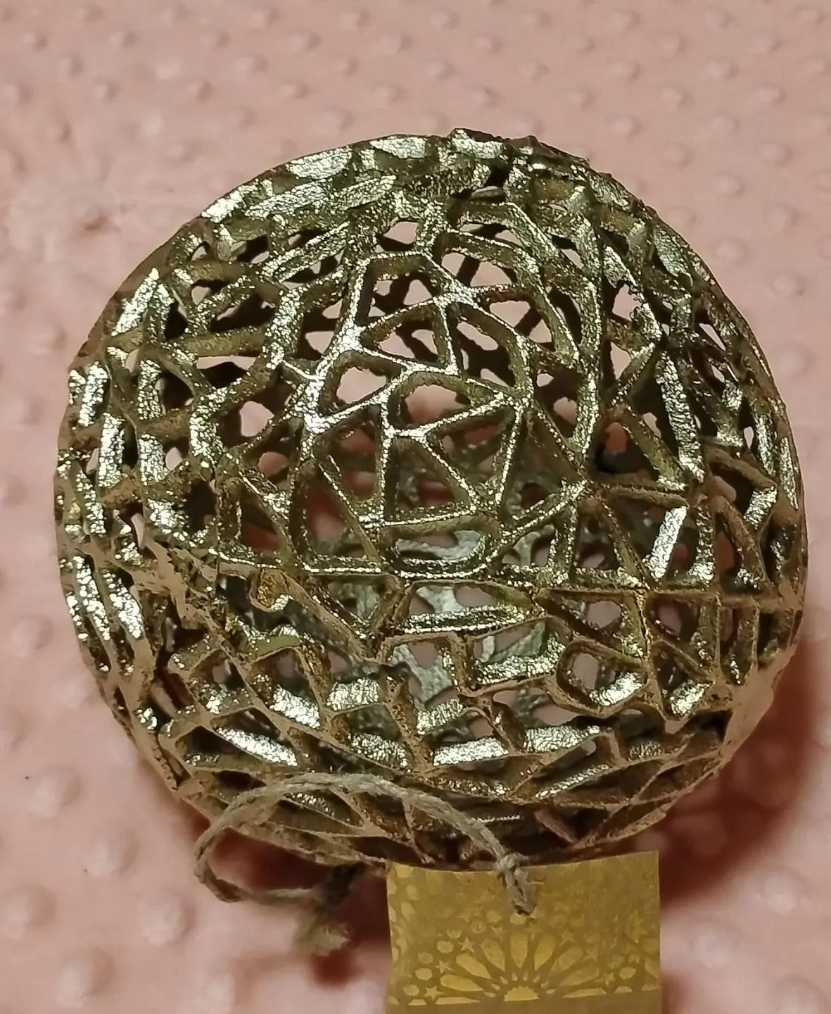 Selling a gold decorative sphere. It has a unique geometric design and would look great as part of a centrepiece or on a shelf! Has a twine detail on the bottom.