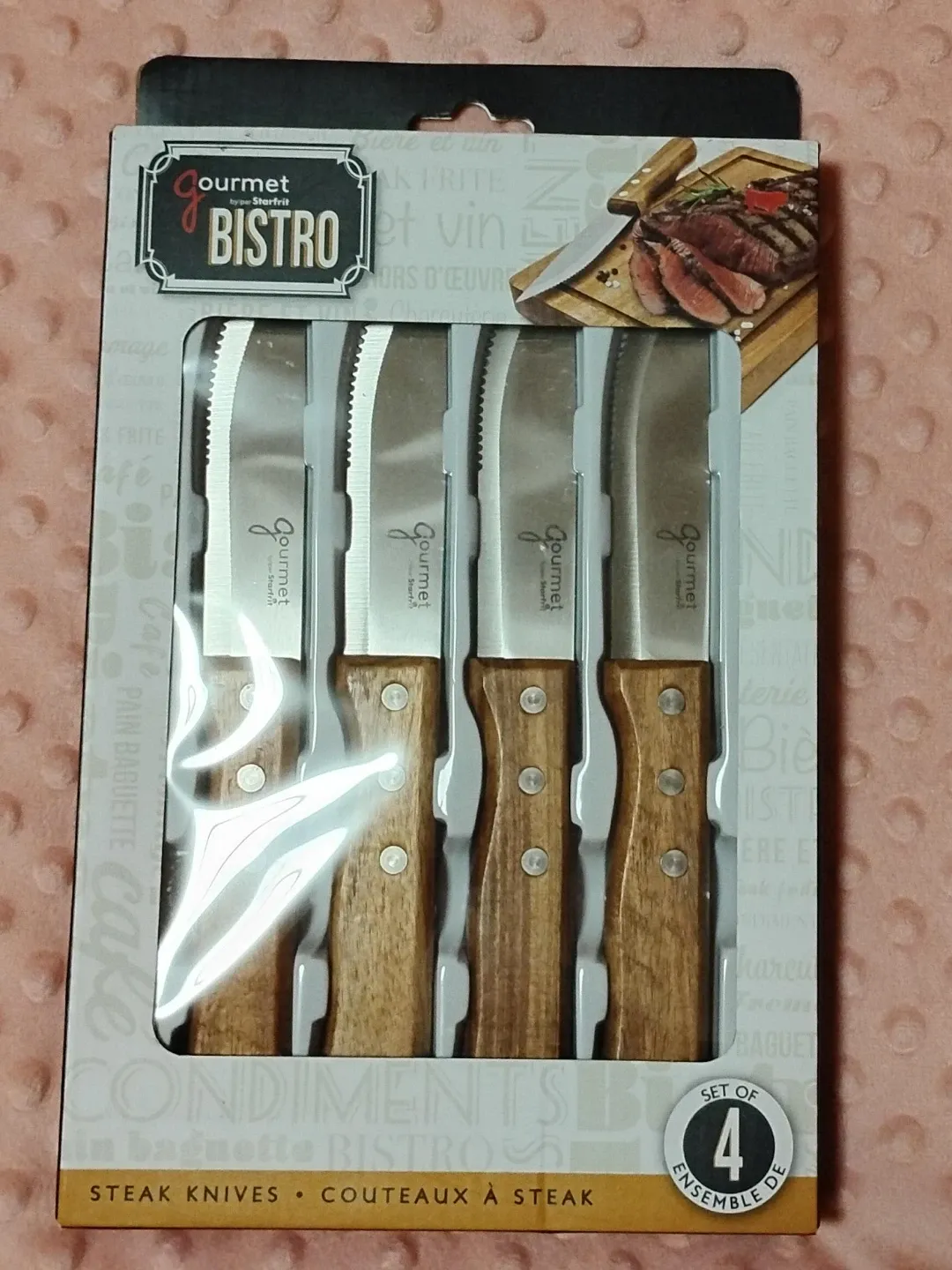 Selling a set of 4 Gourmet by Starfrit Bistro steak knives! They're perfect for enjoying a delicious steak dinner with friends and family. The knives are brand new, still in their original packaging.