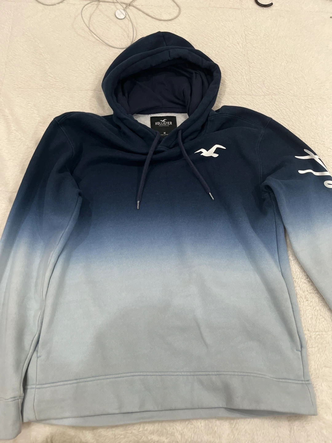 Selling a Hollister hoodie in an ombre design, fading from dark blue to light blue. It's a size medium and in great condition!
