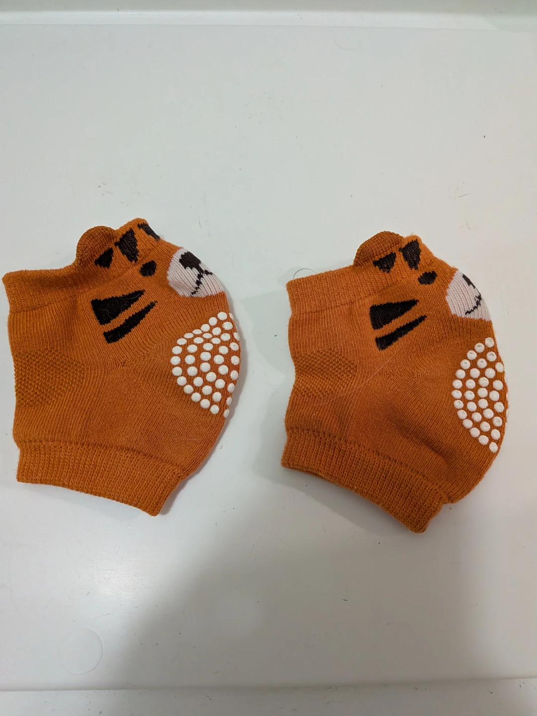 Selling a pair of adorable orange baby knee pad with a tiger print design! They have non-slip grips on the bottom, perfect for little ones learning to walk. They are in great condition.