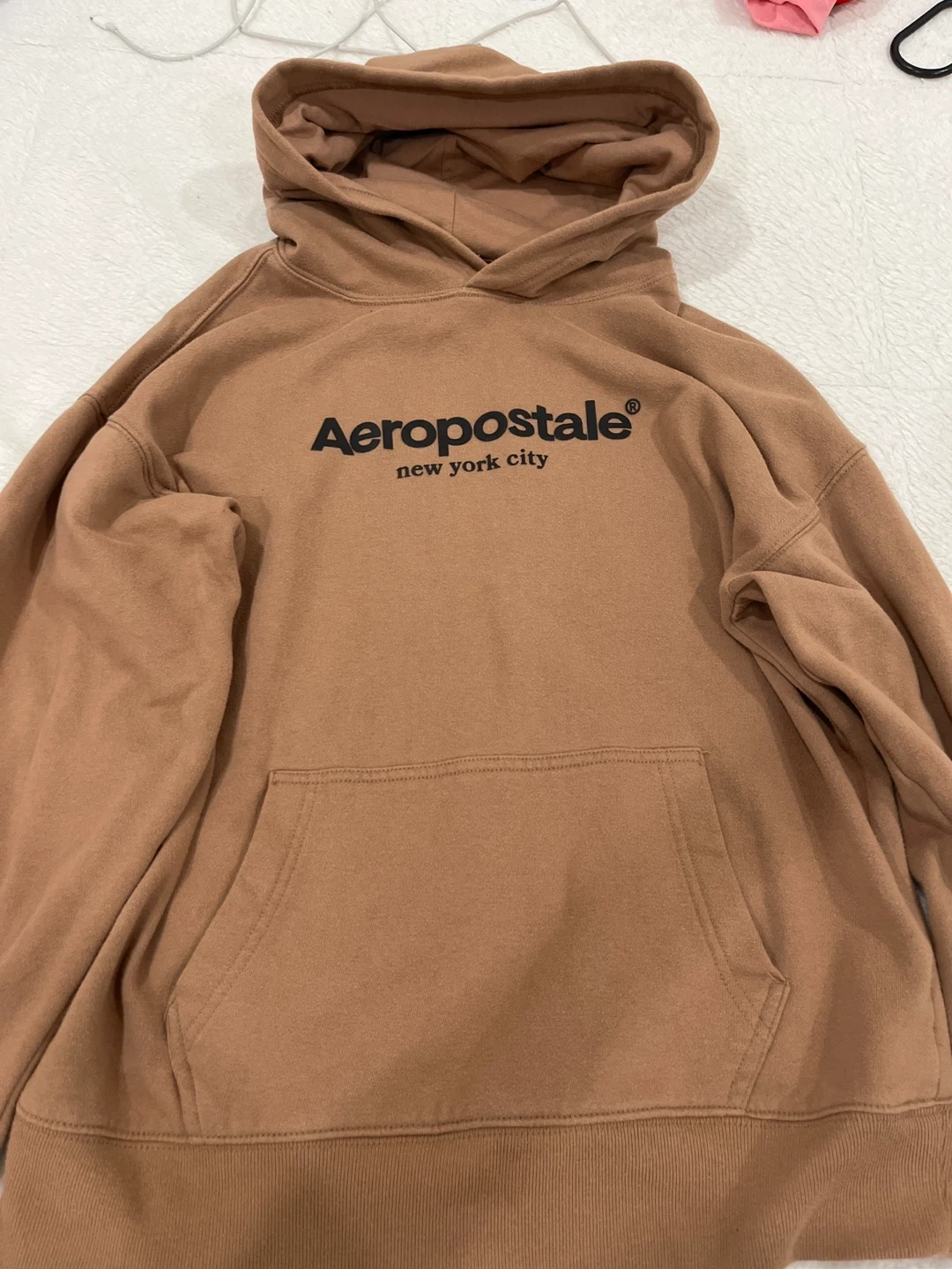 I'm selling an Aeropostale hoodie in size XS in men in a brown color. It has the Aeropostale logo with 'new york city' printed below it. It also has a front pocket. Let me know if you are interested!