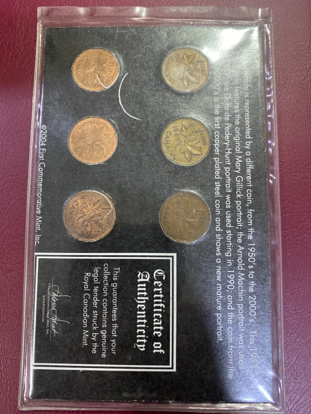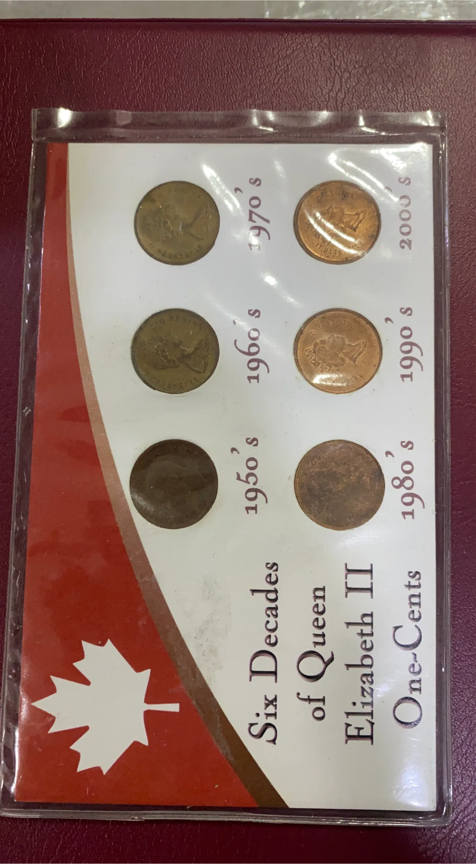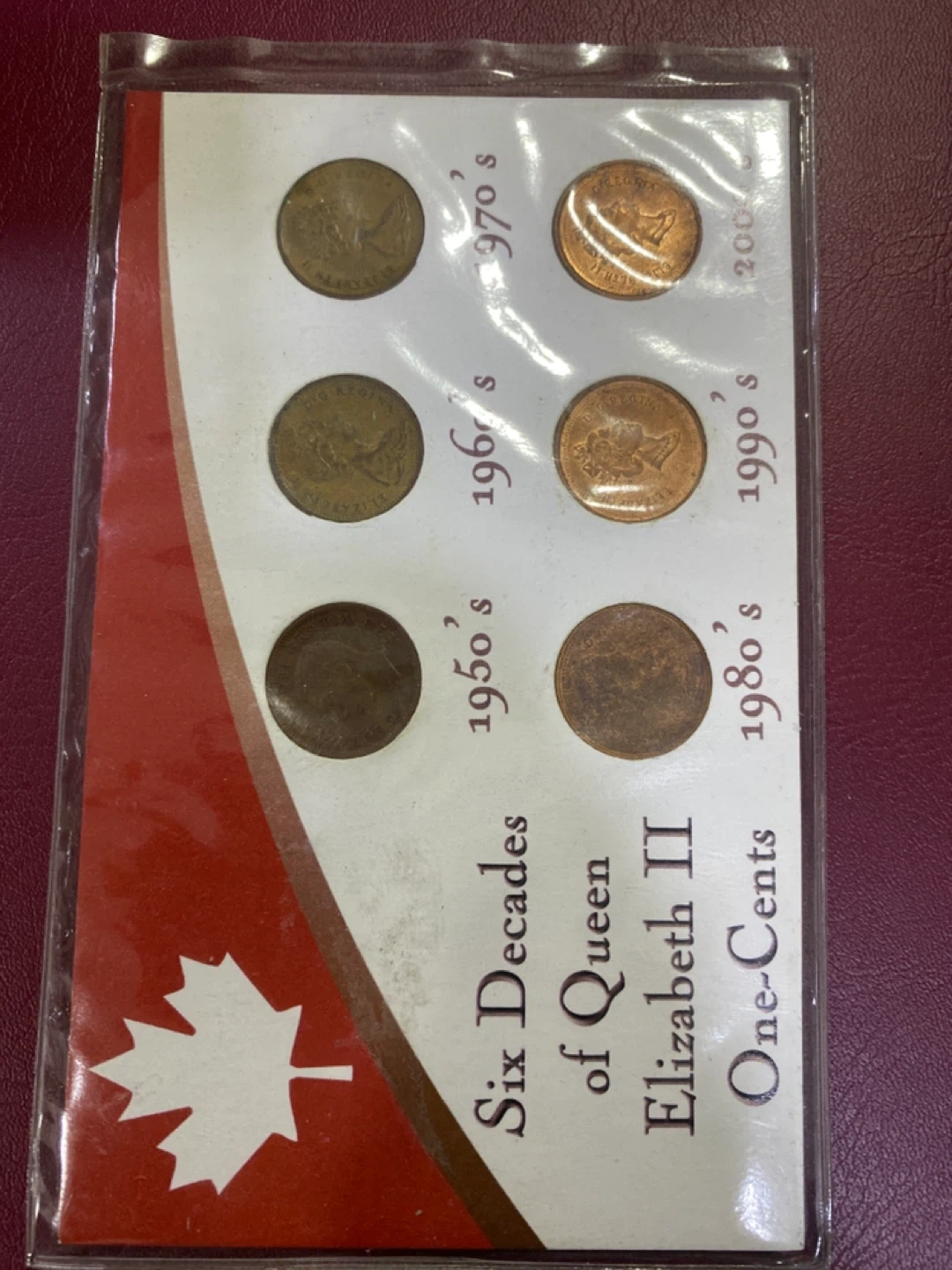 Selling a commemorative collection of Canadian one-cent coins, representing six decades of Queen Elizabeth II's reign. This set includes coins from the 1950s to the 2000s, each with a unique portrait. The collection comes with a certificate of authenticity, guaranteeing that the collection contains genuine legal tender struck by the Royal Canadian Mint