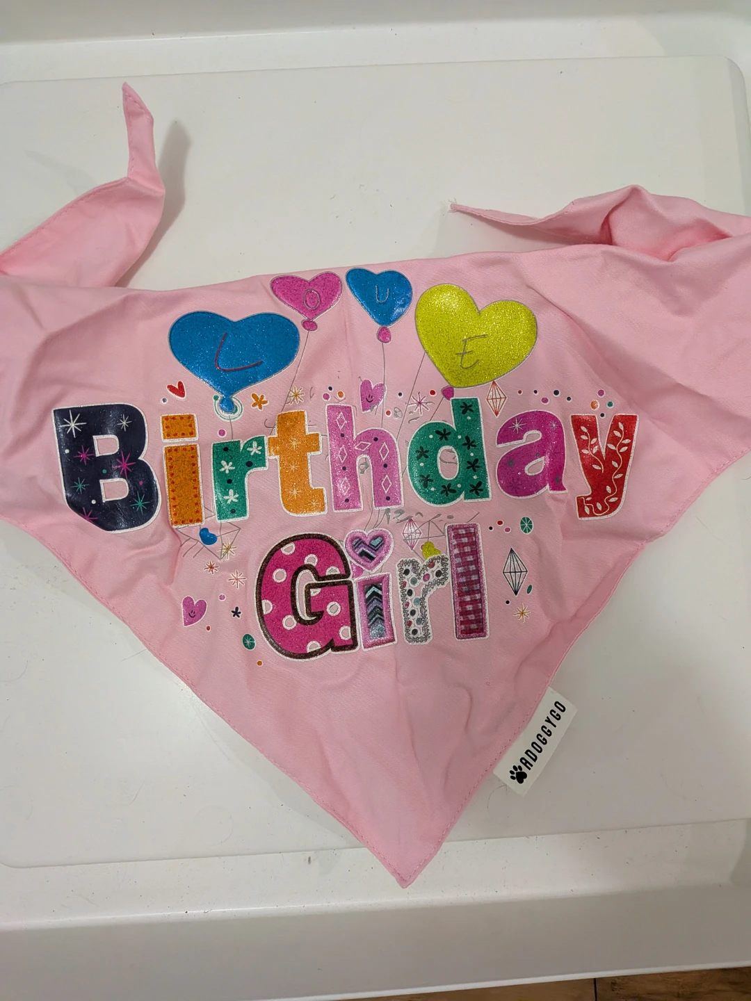 Selling a cute ADOGGYGO dog bandana for a birthday girl! It's pink and has a fun 'Birthday Girl' design with colourful letters and heart balloons. Perfect for your pup's special day!