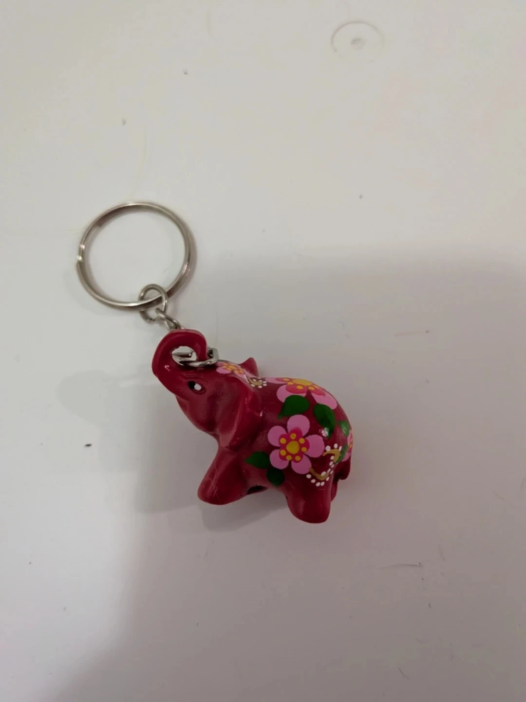 This is a cute little red elephant keychain! It has a lovely floral design painted on it. It's in great condition and ready to add some charm to your keys or bag