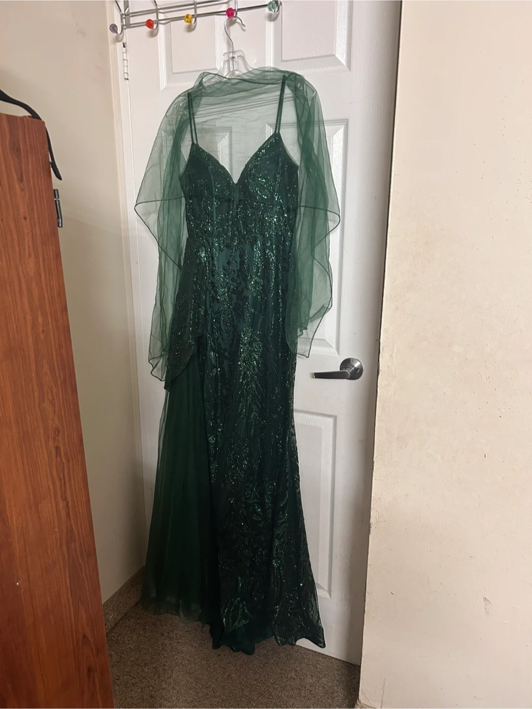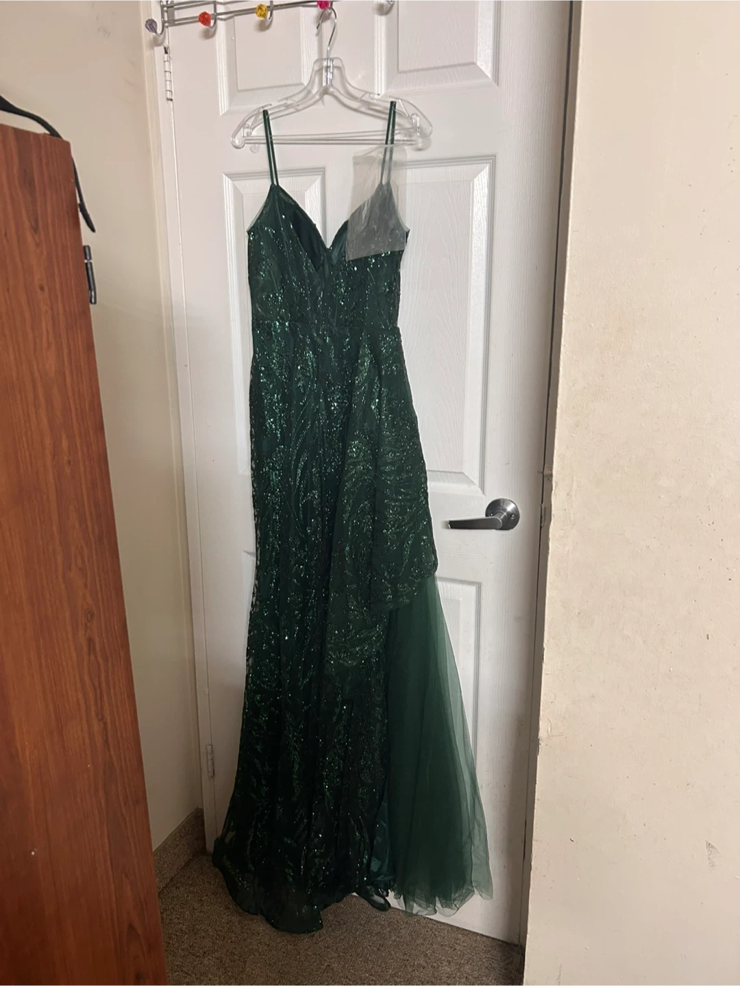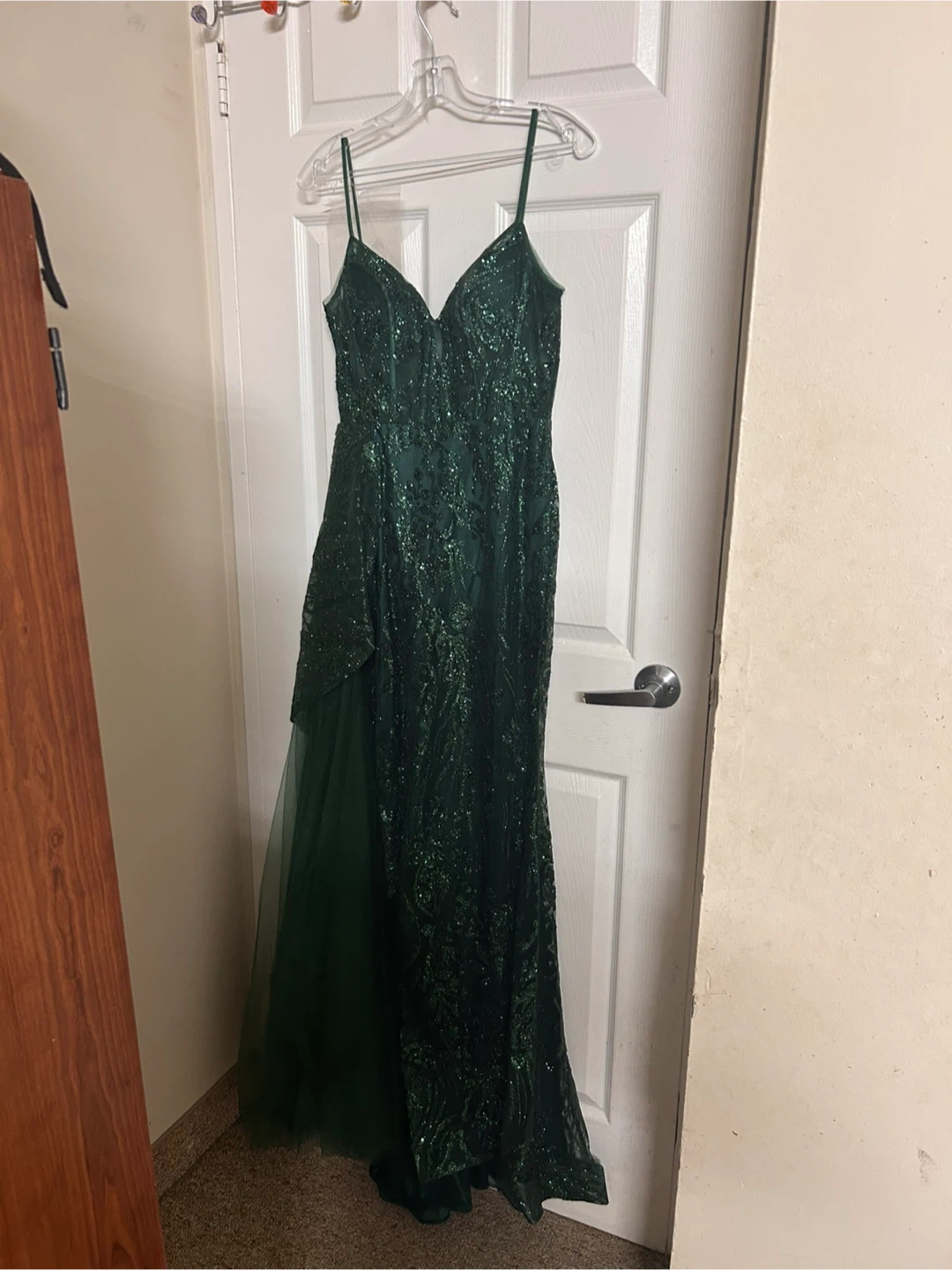 Only worn once, bought in 2025 for prom so completely on trend. Brand new, emerald green and glitters like crazy with many sequins. Has a little leg slit but easily covered by tulle as seen in the pictures.