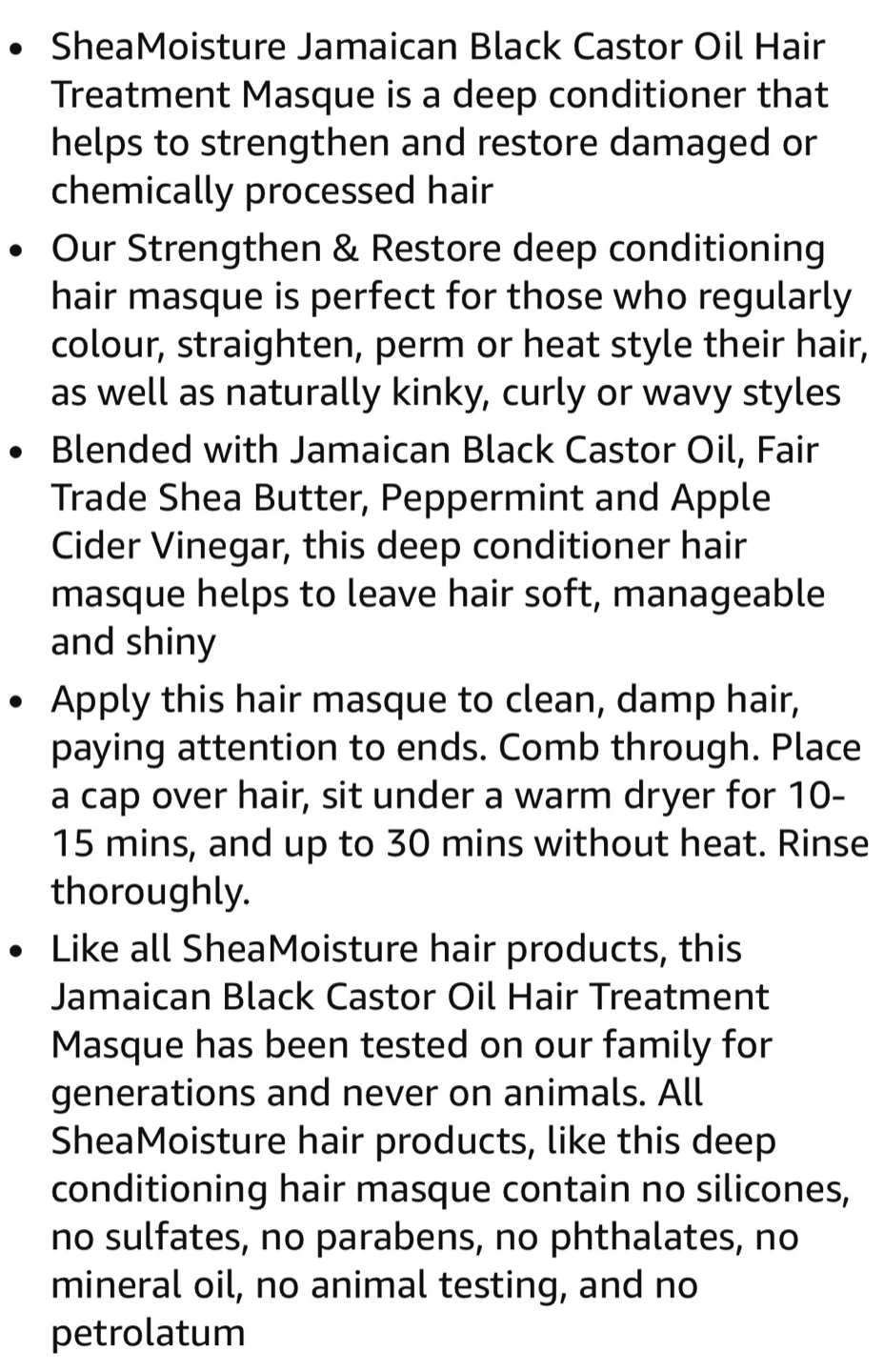 Brand new, sealed and never used SheaMoisture Jamaican Black Castor Oil Strengthen & Restore Treatment Masque. ✨ Details: • Size: 326 g • Strengthens & restores damaged or chemically processed hair • Ideal for natural, curly, kinky, wavy, heat-styled, or color-treated hair • Made with Jamaican Black Castor Oil, Shea Butter, Peppermint & Apple Cider Vinegar • Leaves hair soft, manageable, and shiny • Color-safe • No silicones, sulfates, parabens, phthalates, mineral oil, or petrolatum • Never tested on animals 📦 Condition: Brand new, sealed 💲 Retail: $15 💲 Asking price: $8 FIRM 📍 Pickup: Islington & Finch or Jane & Eglinton 🚗 Delivery available within a reasonable distance 💰 Cash or e-transfer accepted
