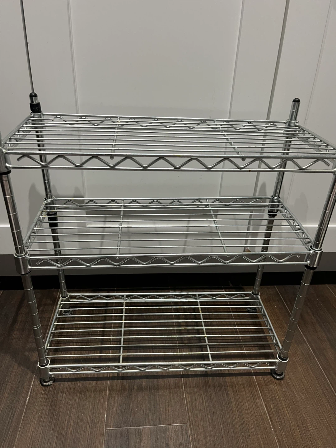 Selling a handy 3-tier chrome wire shelving unit! It's perfect for adding extra storage in your kitchen, bathroom, or closet. It's in great shape and ready to help you get organized