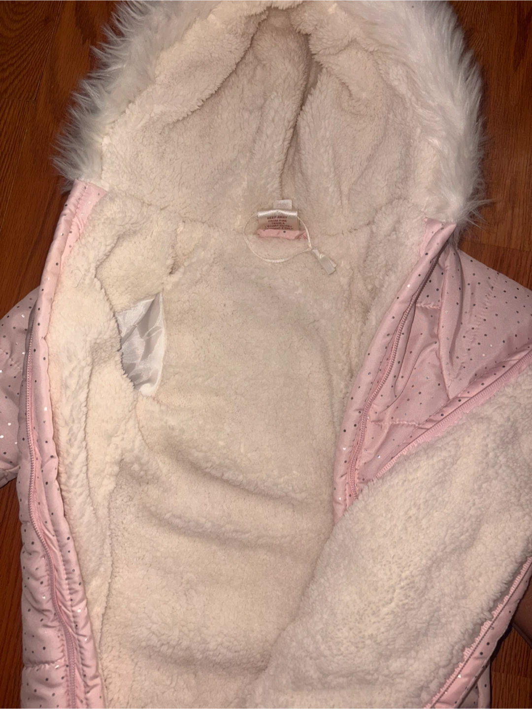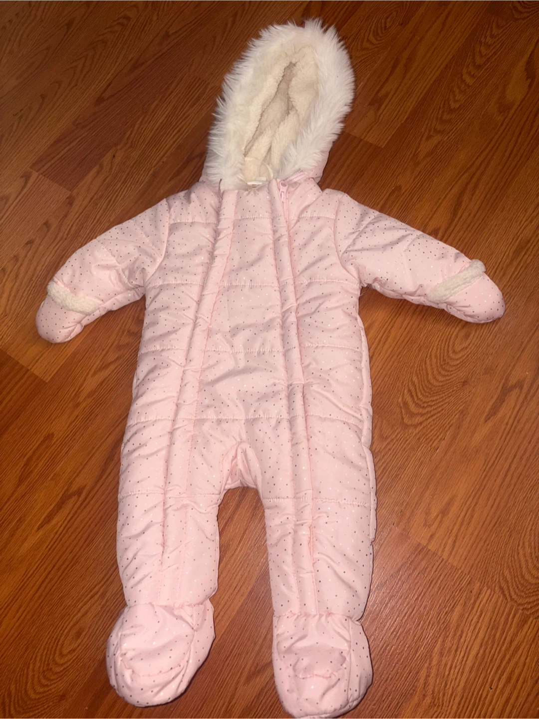 This adorable pink snowsuit from Carter's is perfect for keeping your little one warm this winter! It's a size 6-9M and features a cozy, plush lining and a cute, furry hood. The snowsuit is in great condition and ready for some snowy adventures!