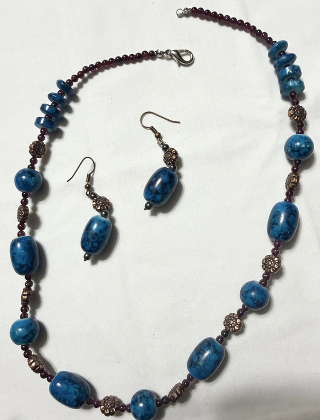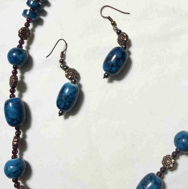 This is a necklace and earring set in good condition. It features blue stones and comes with a pair of matching earrings. This set will add a nice pop of colour to any outfit!