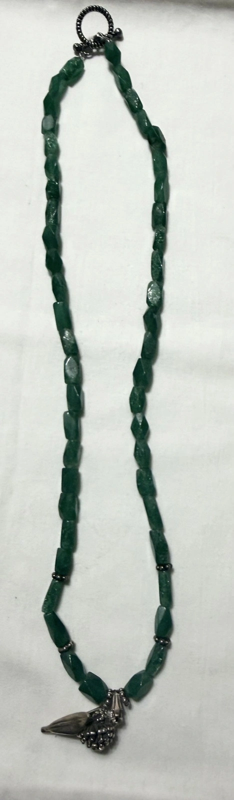 This is a striking used necklace featuring green stones and a unique silver pendant. The necklace is in good condition and adds a touch of elegance to any outfit. * Stone Type: Green Stone * Pendant Material: Silver This charming piece is waiting for a new home! If the ad's up, it's still available!