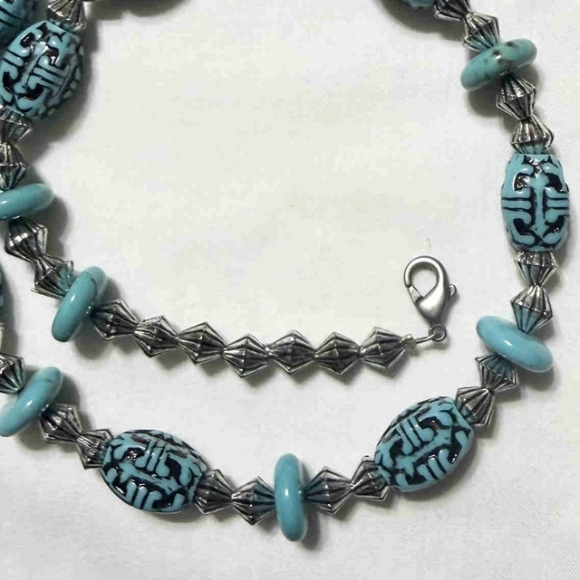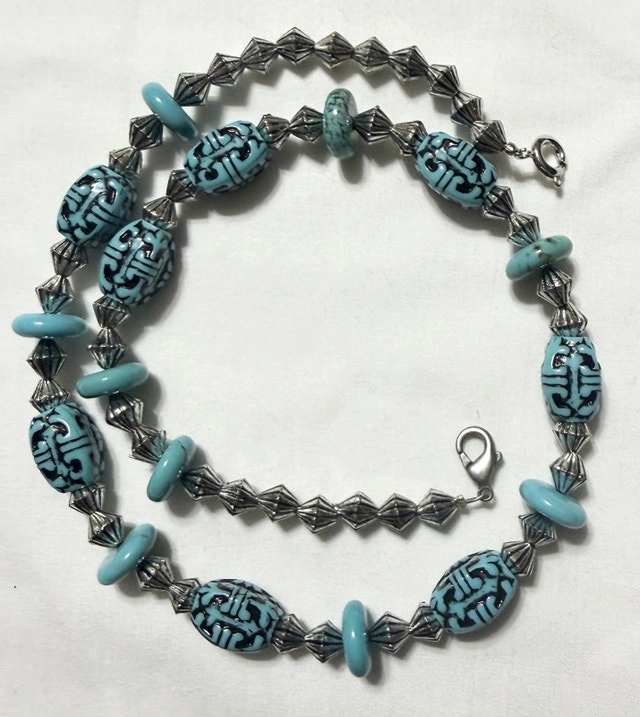 This stylish, used beaded necklace features turquoise-coloured beads with intricate black detailing, complemented by silver-toned accents. The necklace is in good condition and adds a unique touch to any outfit. Crafted with care, this necklace offers a blend of cultural inspiration and modern style, perfect for adding a distinctive accent to your wardrobe. * Unique turquoise and black bead design * Silver-toned metal accents * Lobster claw clasp