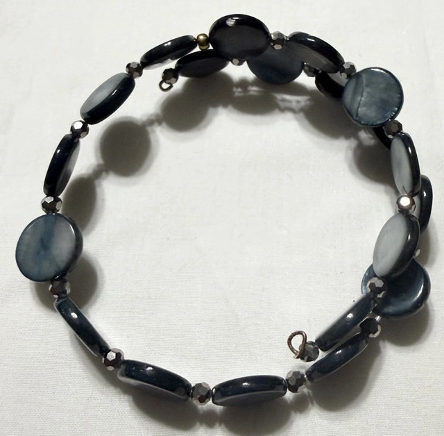features a collection of flat, round, and oval blue beads, complemented by small, metallic grey spacer beads, all strung on a flexible wire for easy wear.