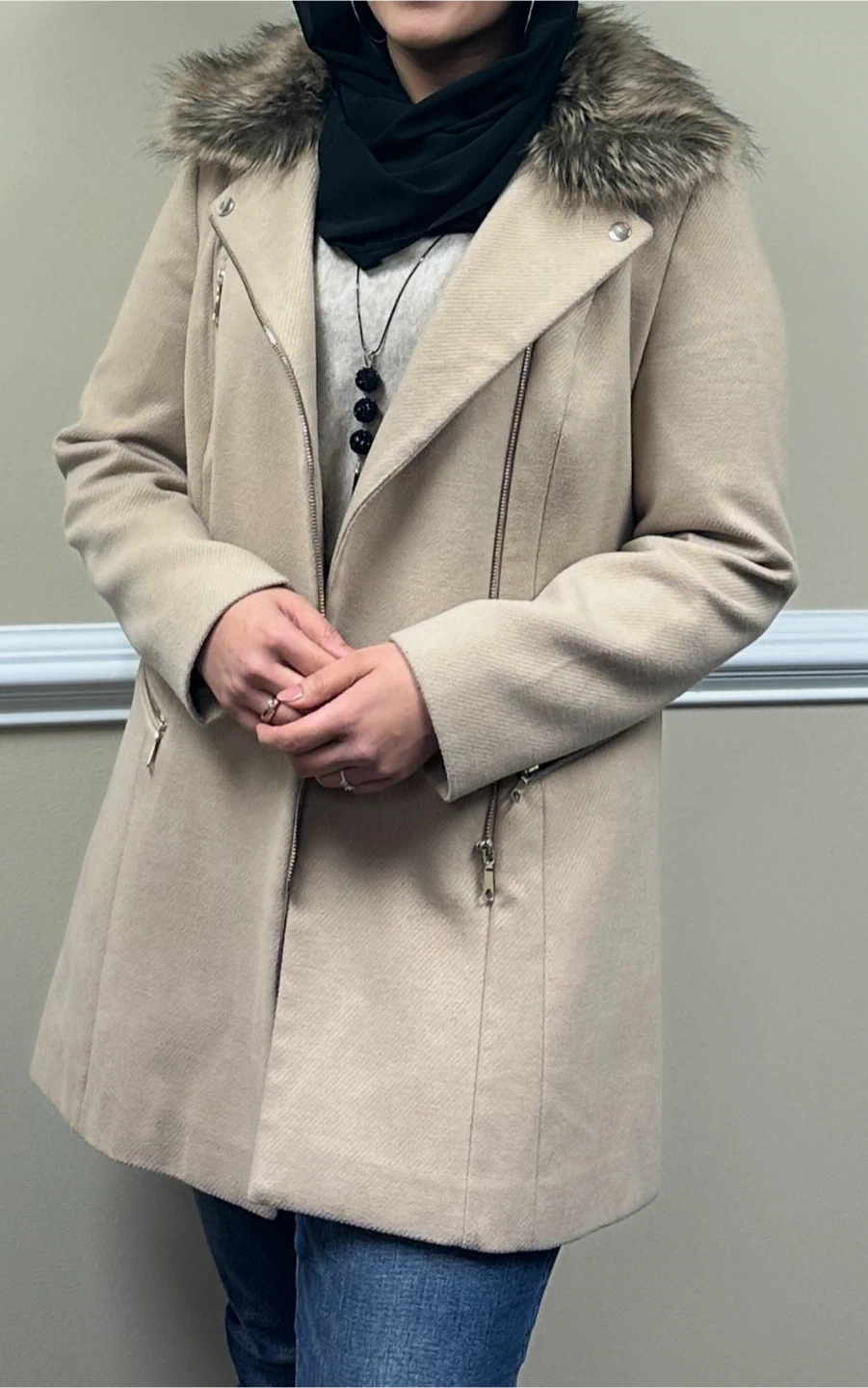 Beautiful Beige Coat with Faux Fur Collar