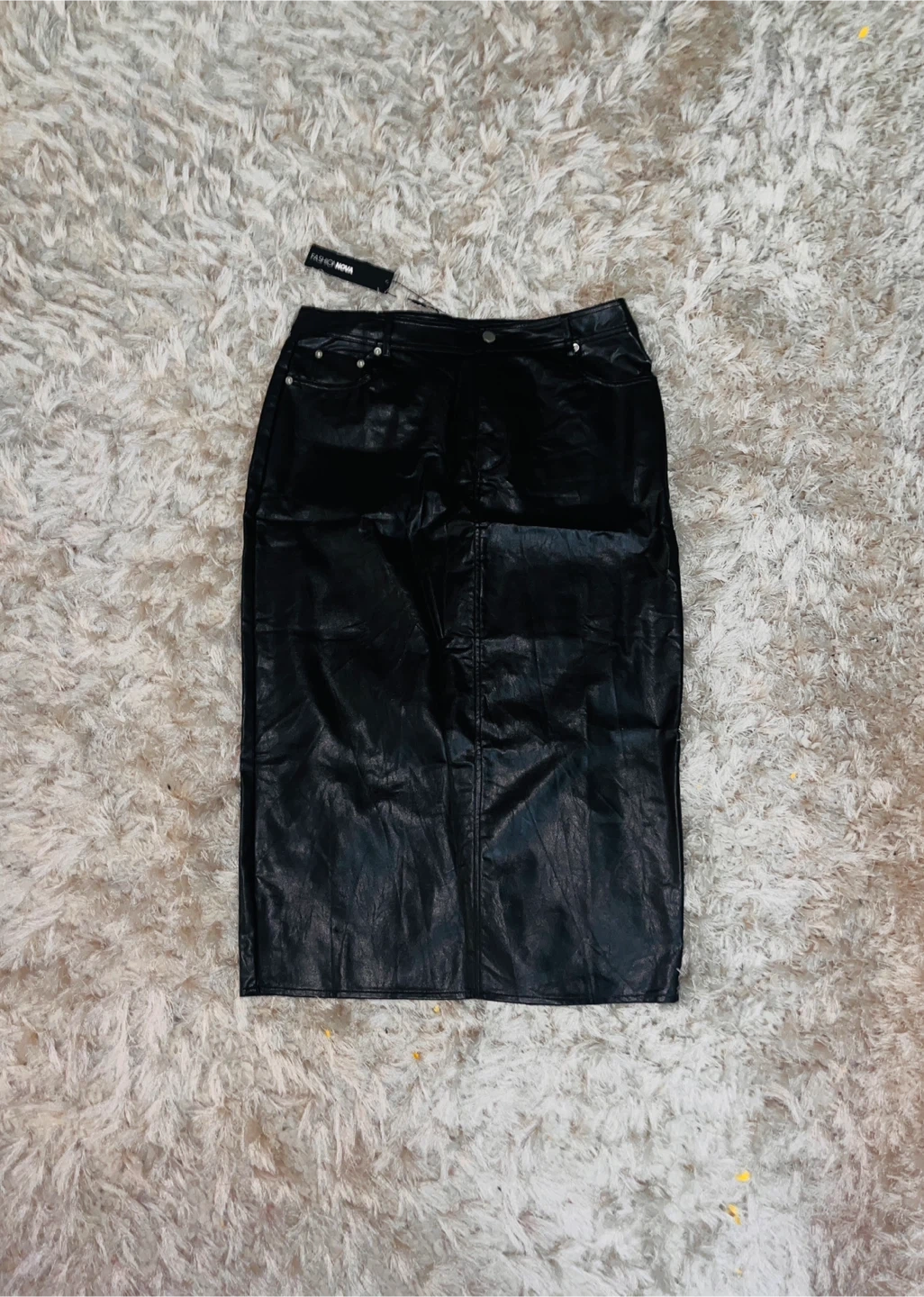 Selling a Fashion Nova black faux leather skirt. It's in great condition and has a sleek, stylish look. Perfect for a night out or a trendy daytime outfit!