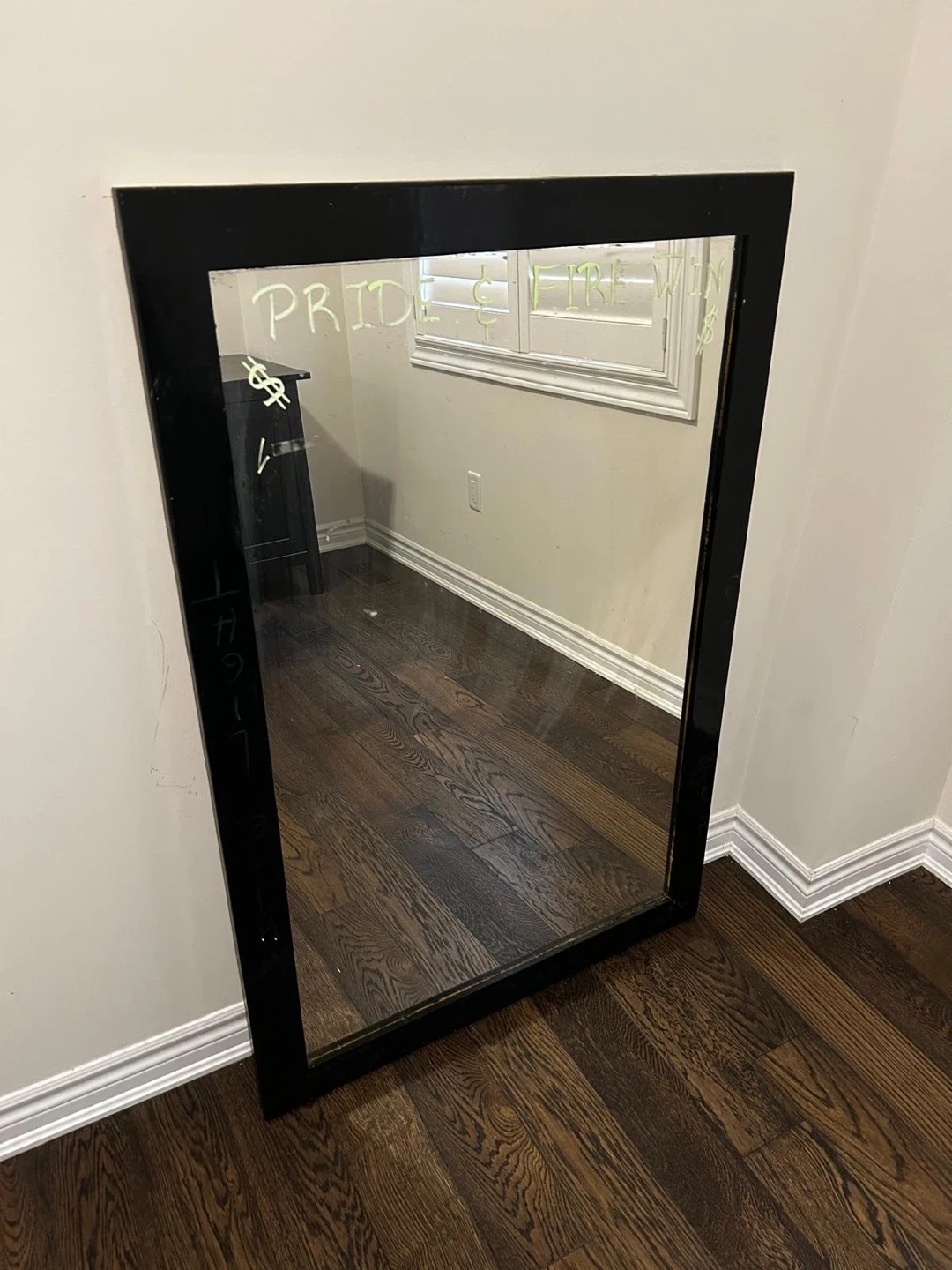 Selling a black framed mirror. It has some writing on the glass, but it can be easily cleaned off. Perfect for adding a touch of style to any room!