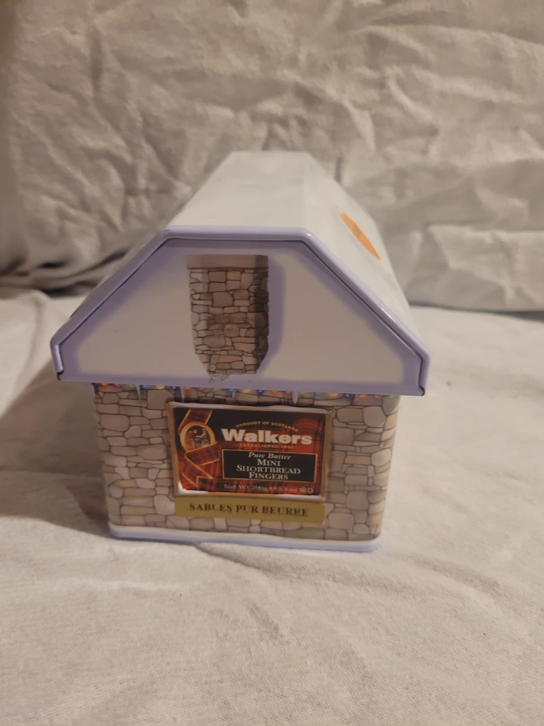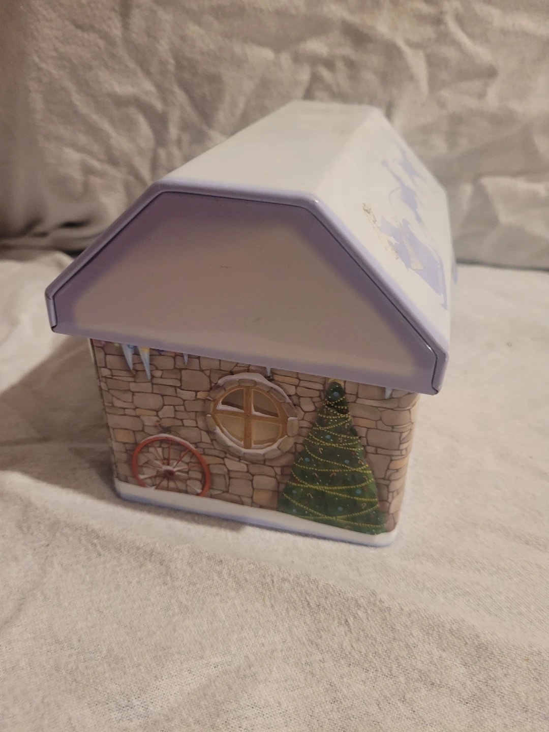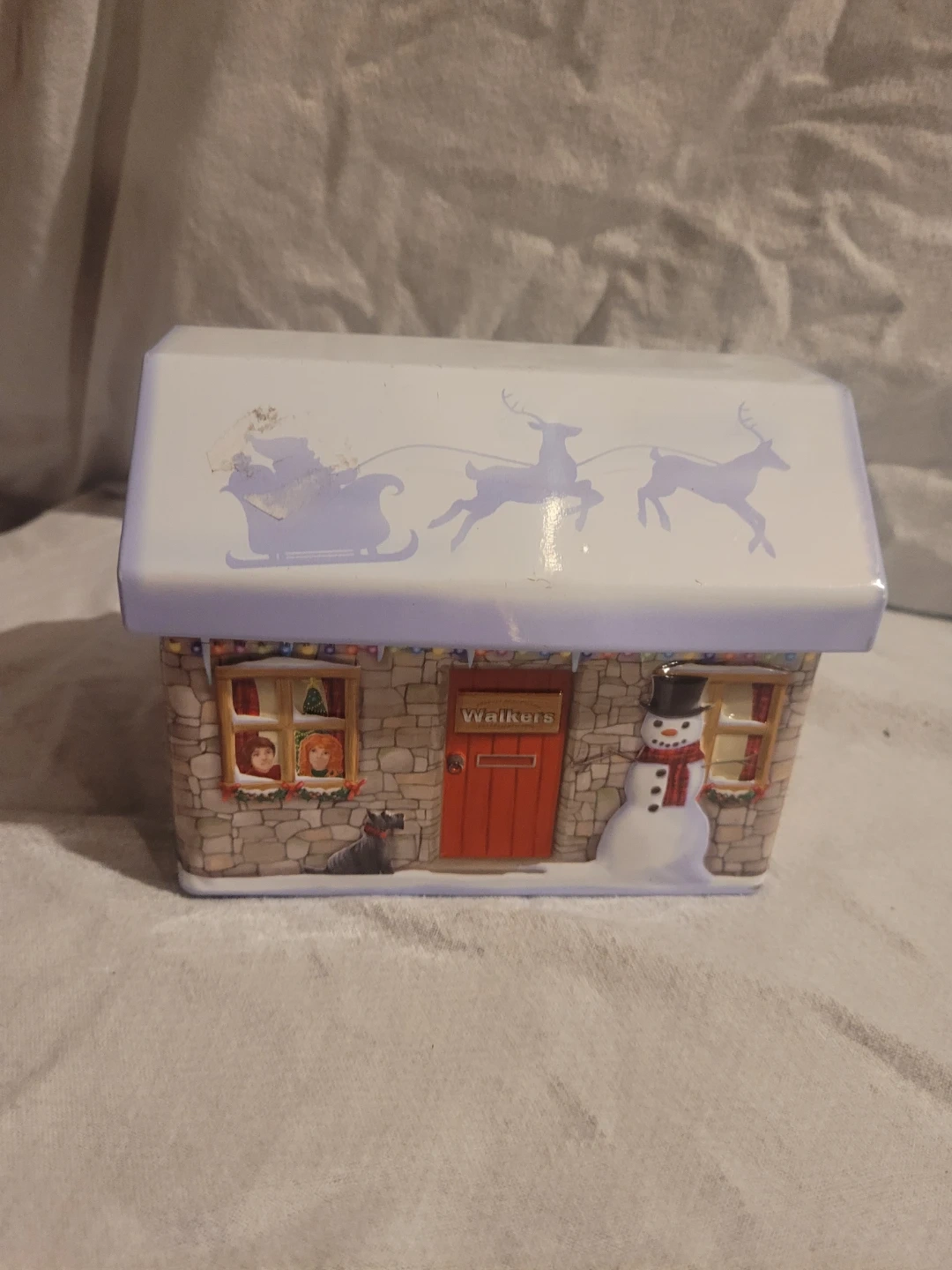 This used Walker's shortbread tin treasure box is a delightful addition to any Christmas collection, featuring festive designs on all sides. It is in good condition. It would be perfect for storing keepsakes or holiday treats.