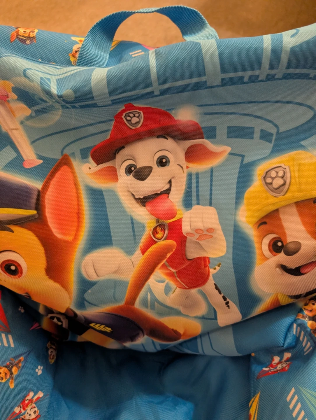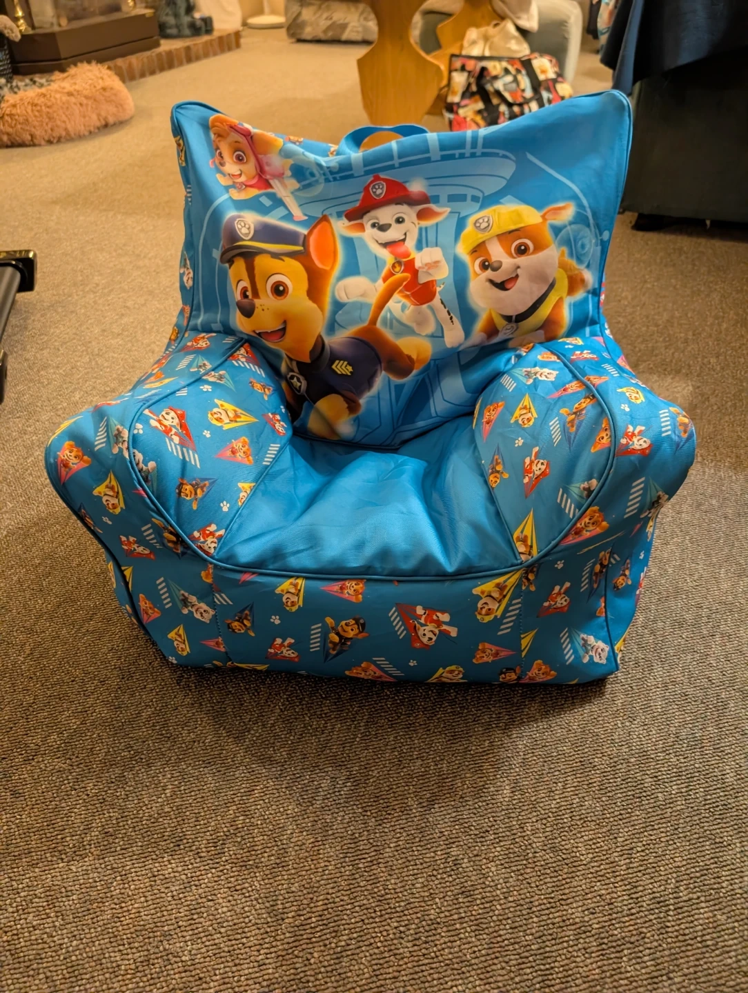 Here's a fun Paw Patrol bean bag chair for your little one! It's in great shape and features Chase, Marshall, and Rubble on a bright blue background. Perfect for a playroom or bedroom!