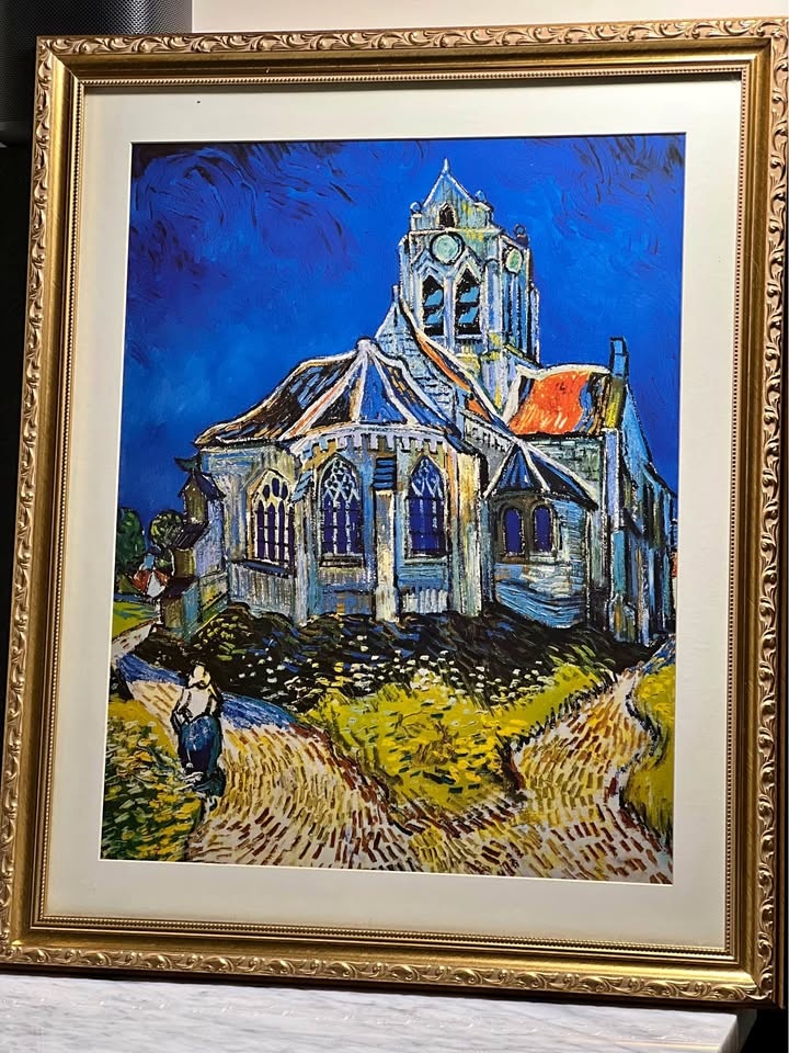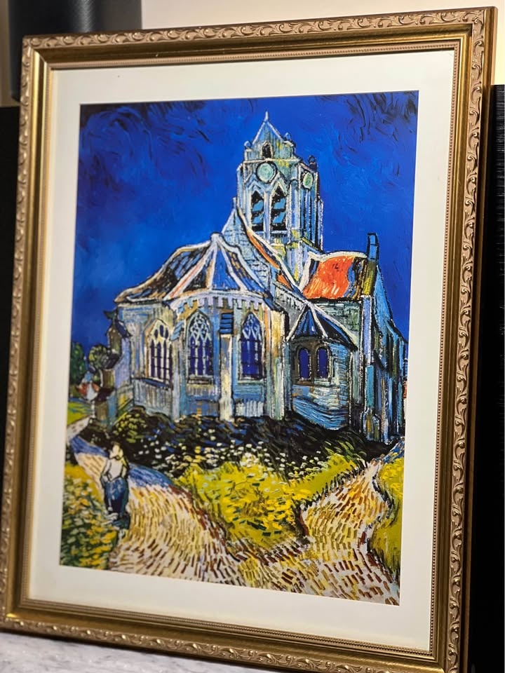 This is a framed print of the famous oil painting, The Church at Auvers, by Vincent van Gogh.