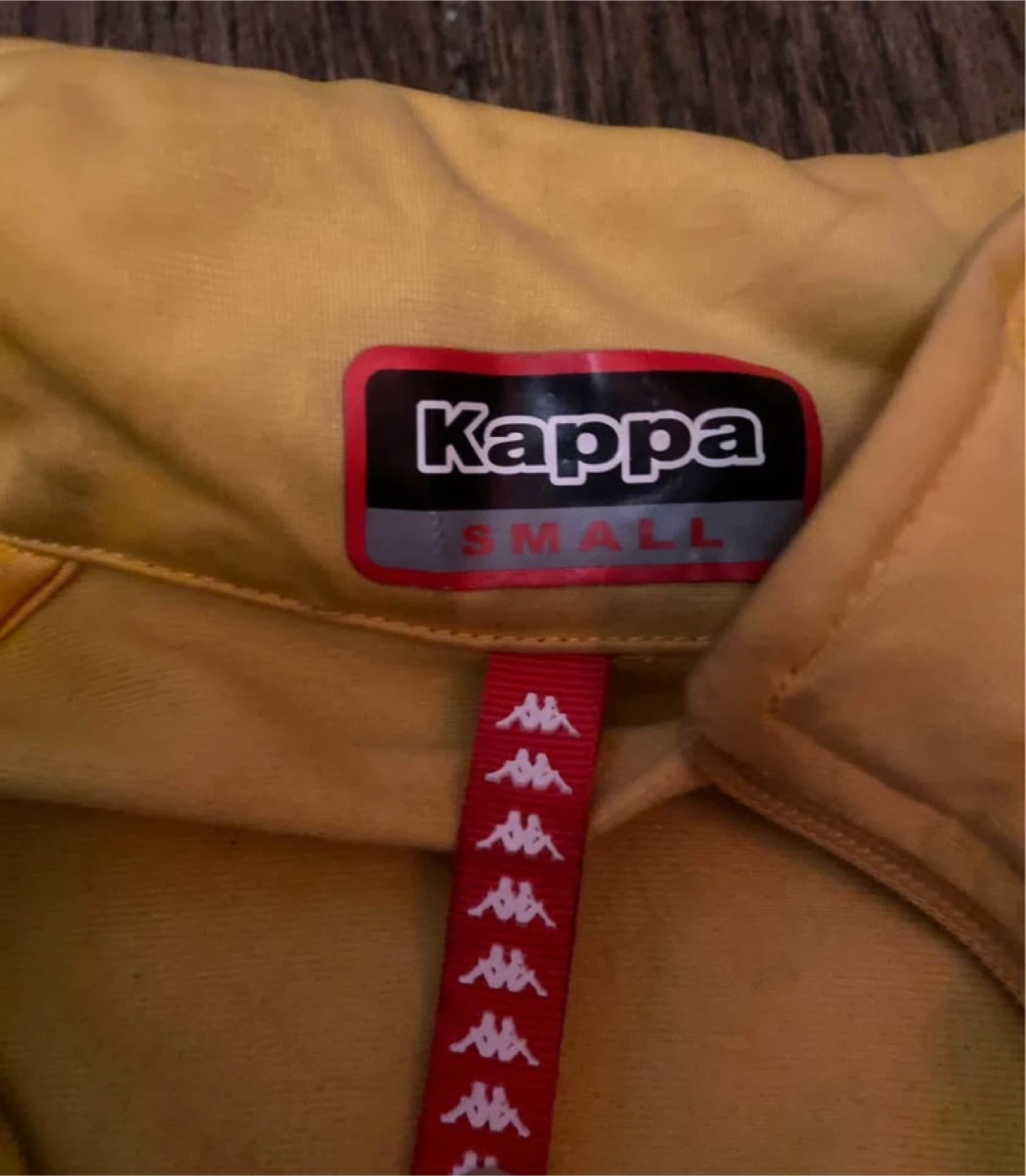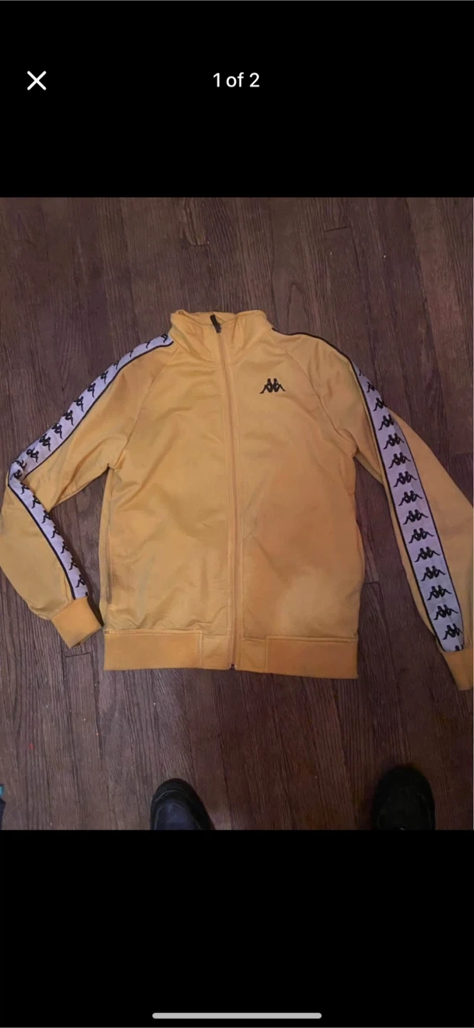 Selling a Kappa track jacket in a vibrant yellow! It's a size small and features the iconic Kappa logo tape down the sleeves. Perfect for adding a pop of colour to your wardrobe