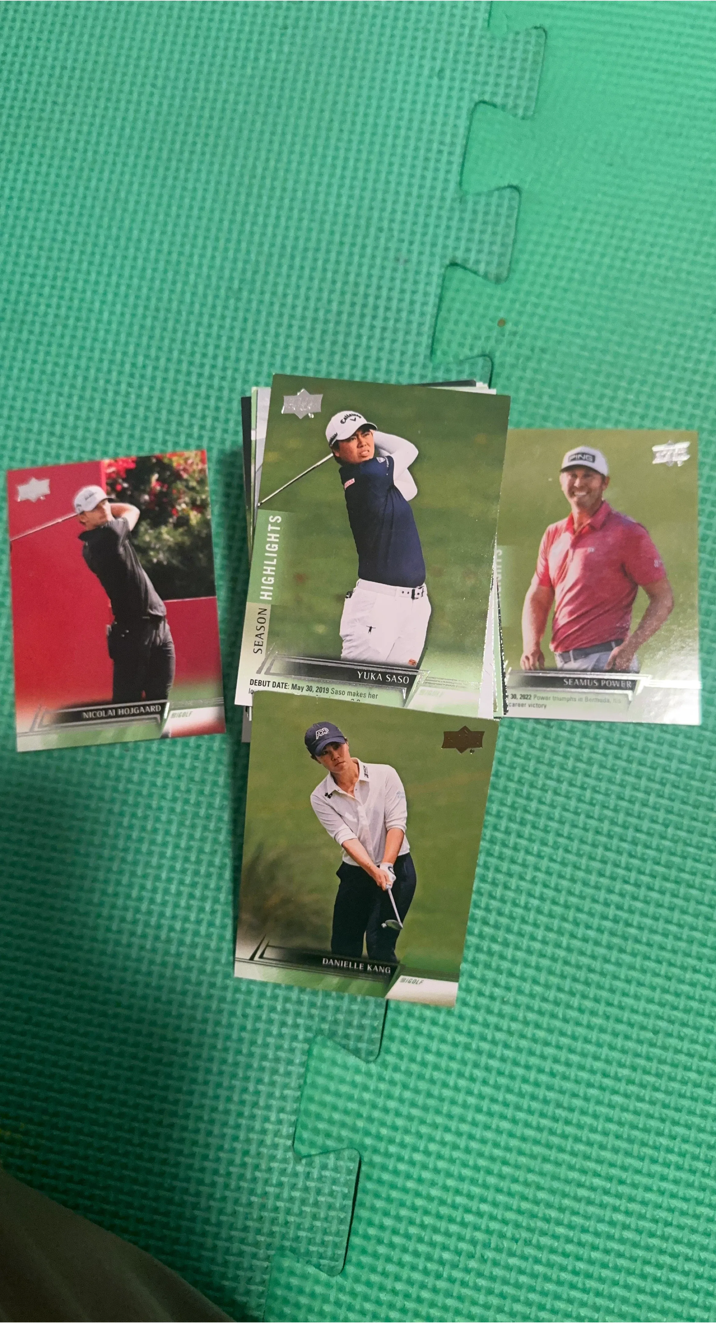 Selling a collection of golf trading cards (60 cards ) featuring players like Yuka Saso, Danielle Kang, Nicolai Hojgaard, and Seamus Power. Great for any golf fan or collector!