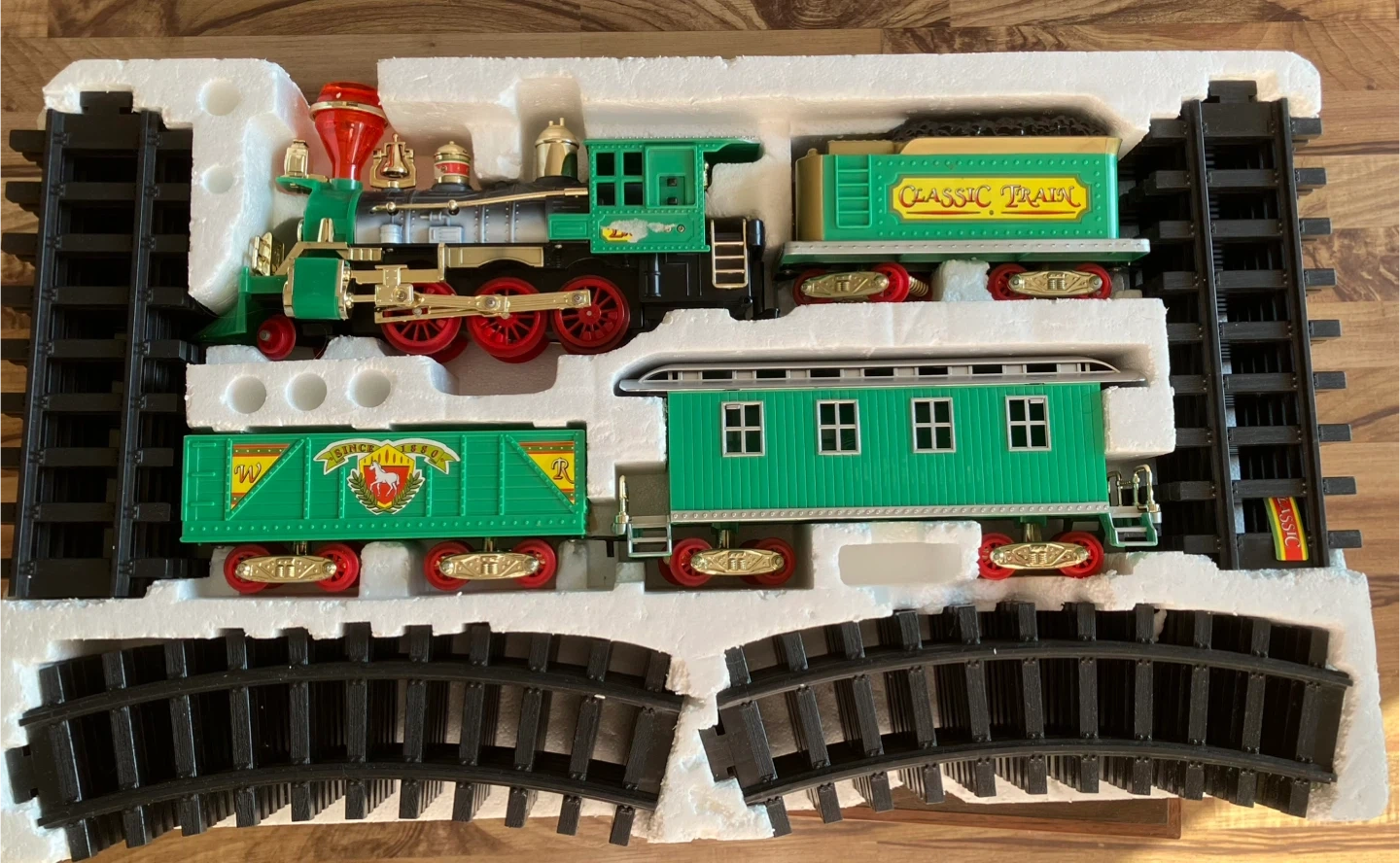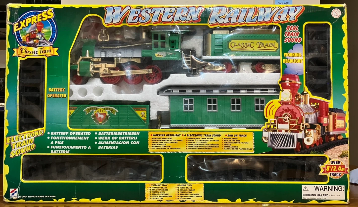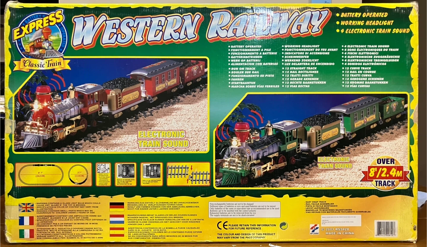 Selling an Express Western Railway Classic Train set! It's battery operated and features working headlights and electronic train sounds. The set includes straight and curved tracks to create an over 8'/2.4m track. Box is included! (play only a few times)