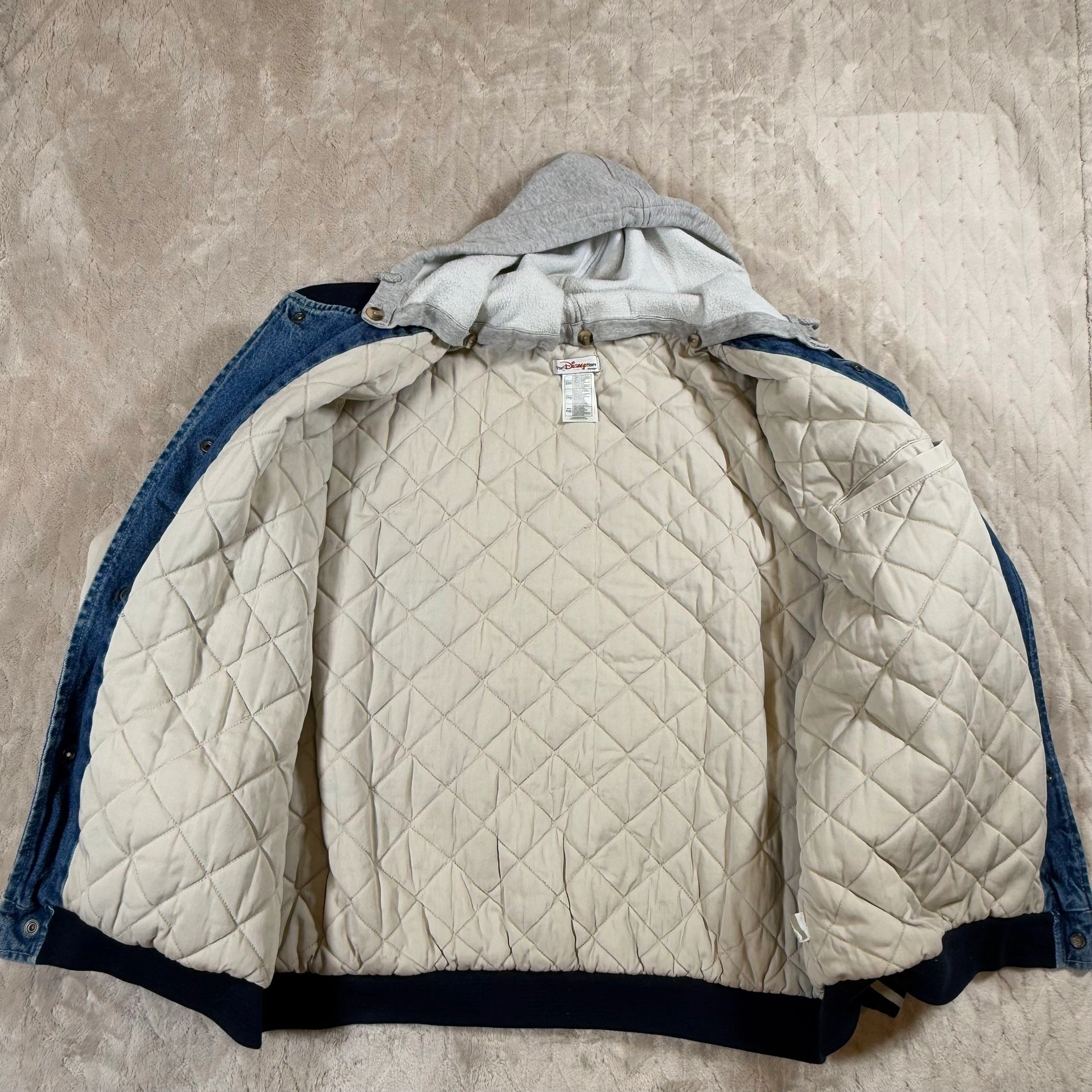 Rare vintage denim bomber jacket. Comes with hoodie. In great preowned condition. Men’s XXL. Measurements: Length 28” Chest 29”. Has a couple stains on the arms (See Pics)