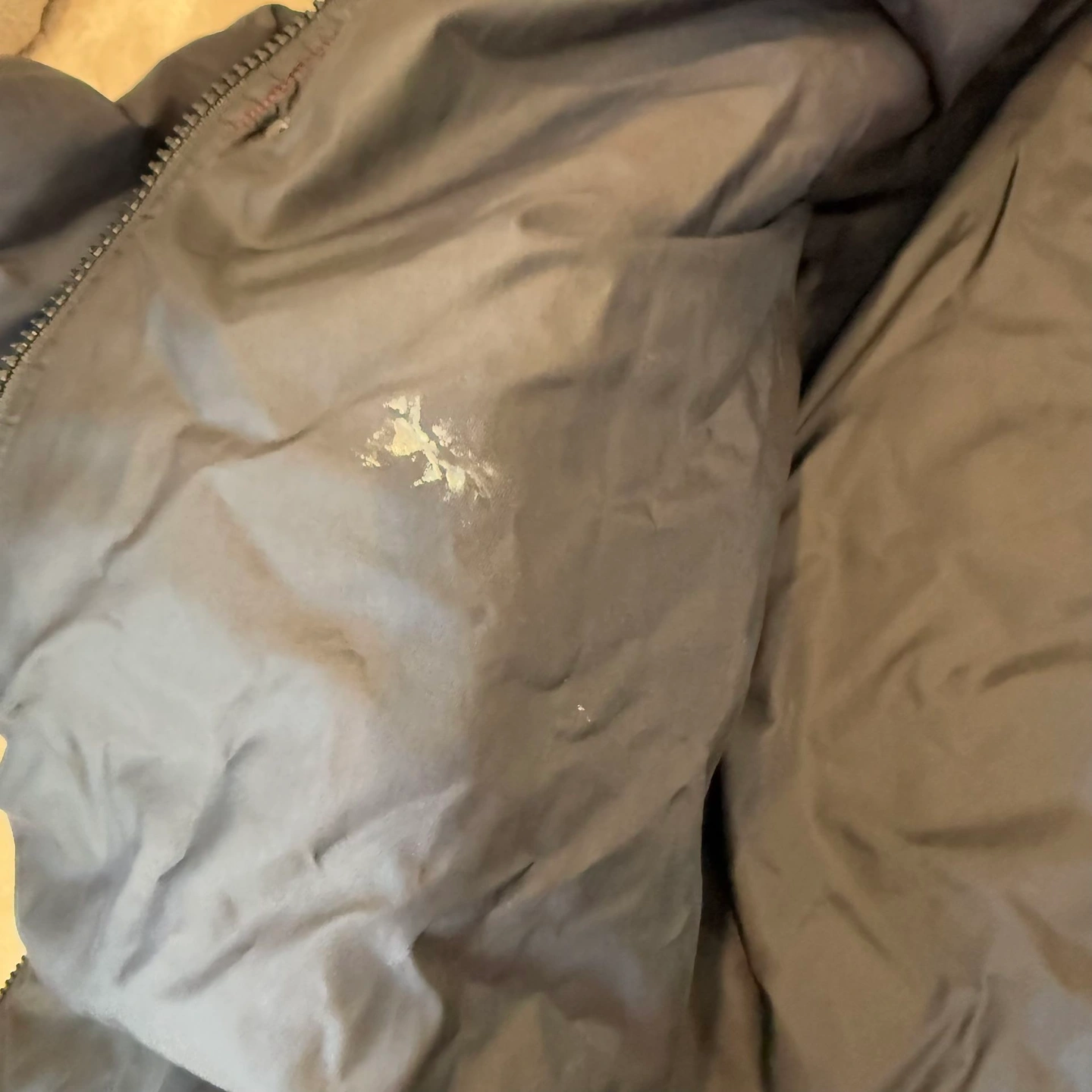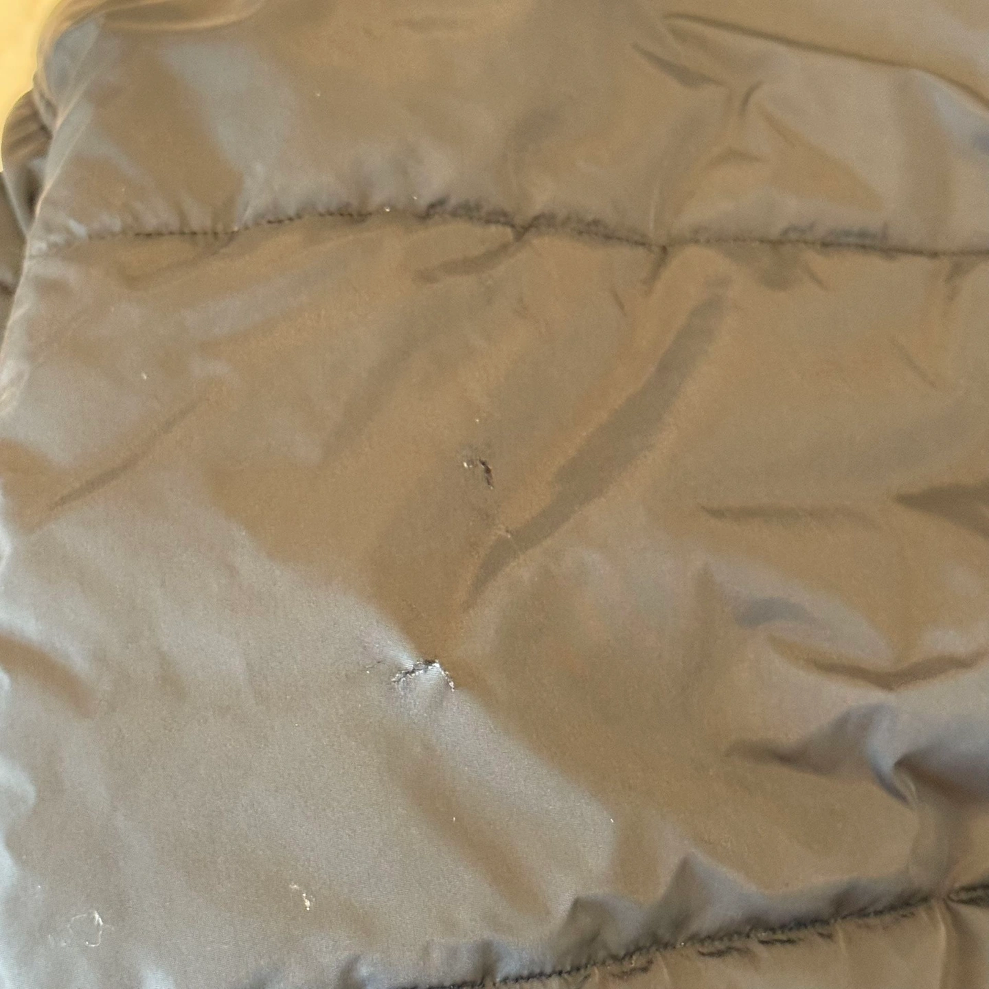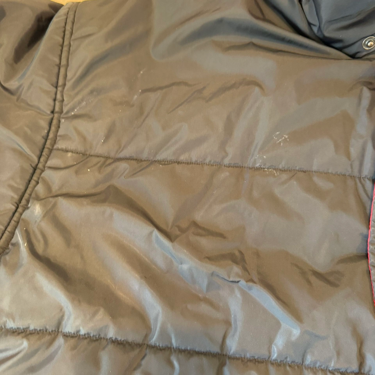 In good preowned condition. Men’s Sz L. Has original hoodie. Has multiple small cosmetic flaws. Zipper works but the pull tab is broken.